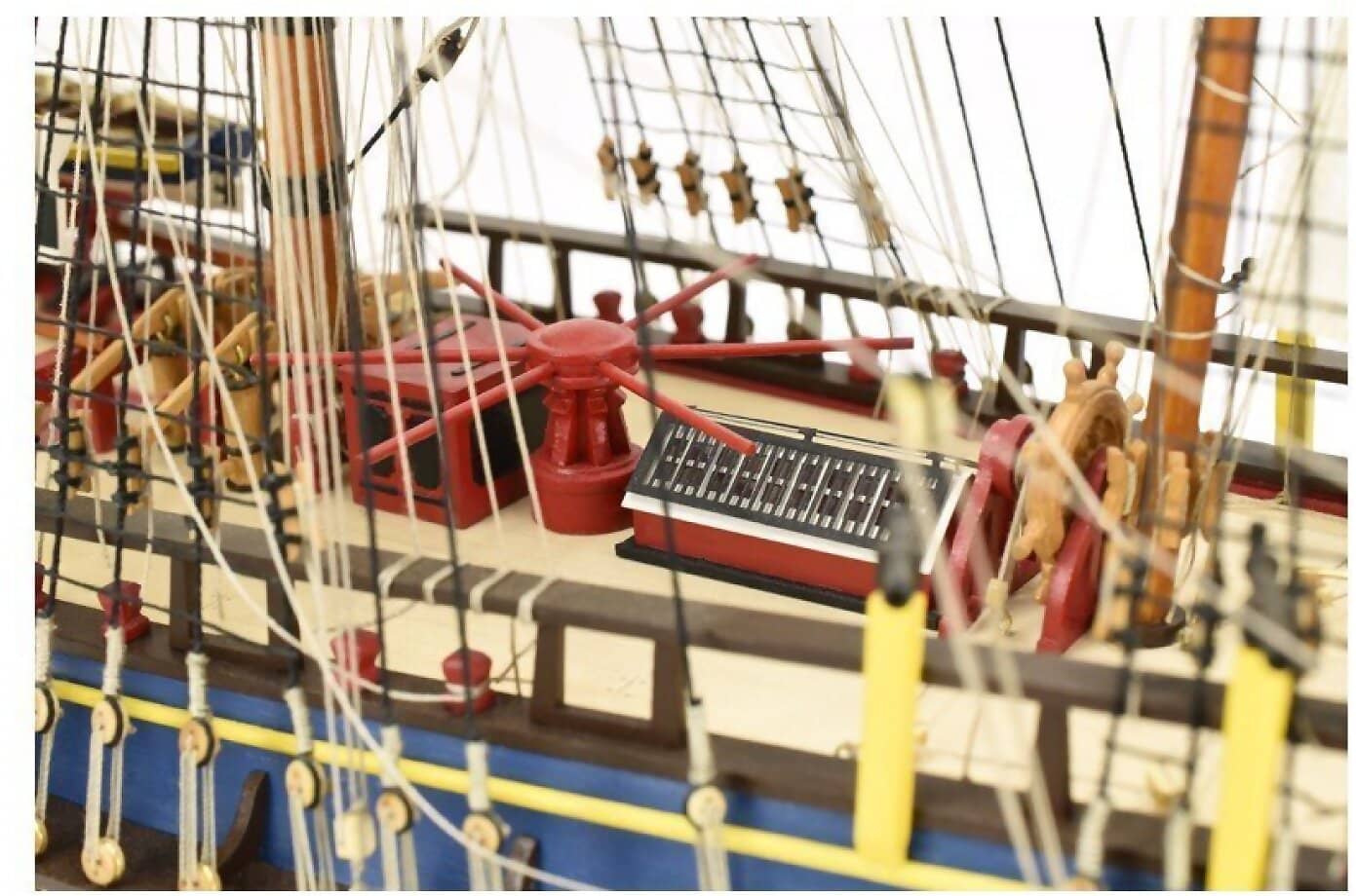 The new modeling kit for the bark, formerly a coaling ship, HMS Endeavour contains birch and linden wood parts -high precision laser cut-, oak and linden veneers, much more realistic finishes with redesigned and very detailed photo-etched and die-cast details, and hand-sewn sails ready to be placed.
