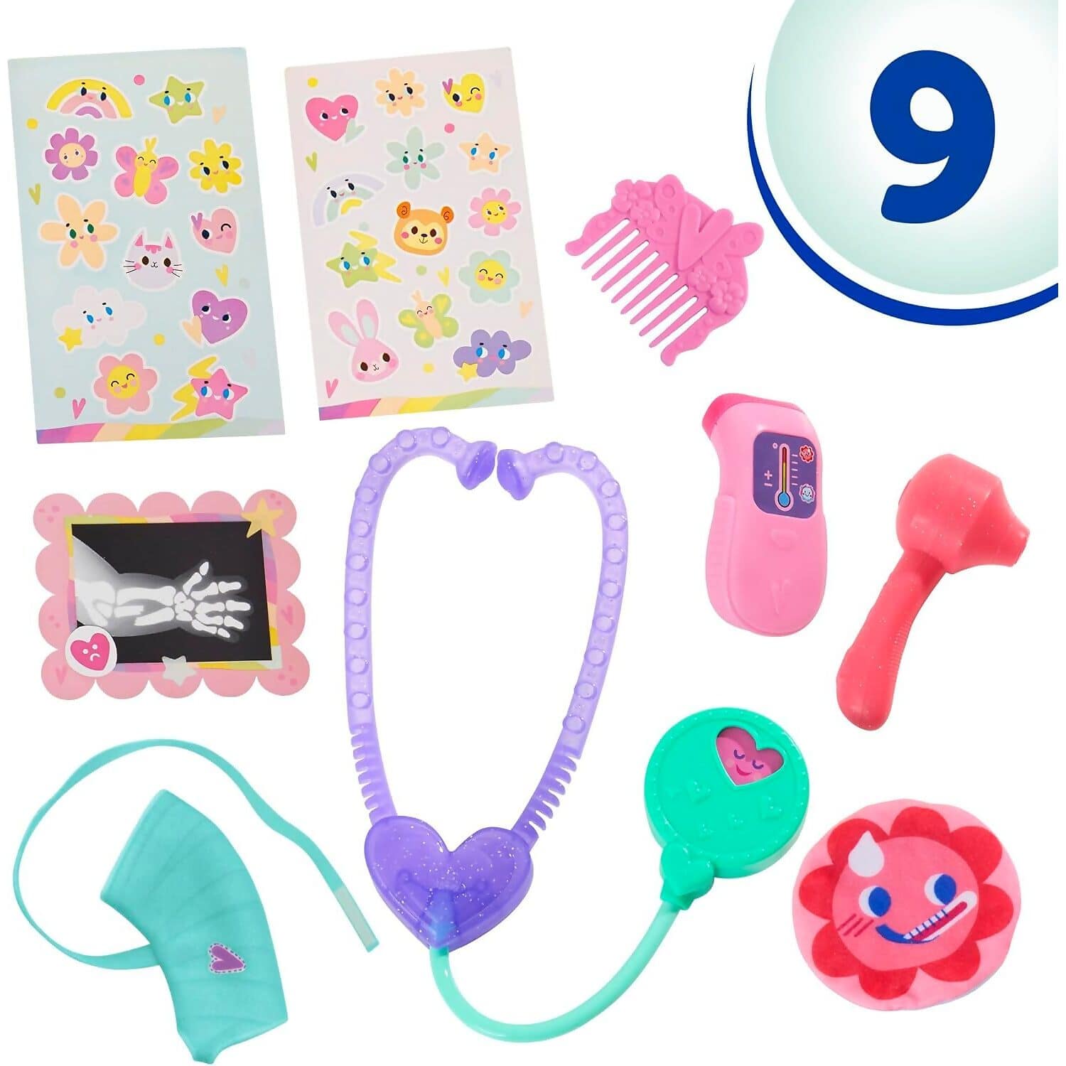 • Comes with 8 accessories: arm cast, stickers, stethoscope, ear checker, thermometer toy, pretend compress pack, 2 x-ray sheets, and comb
