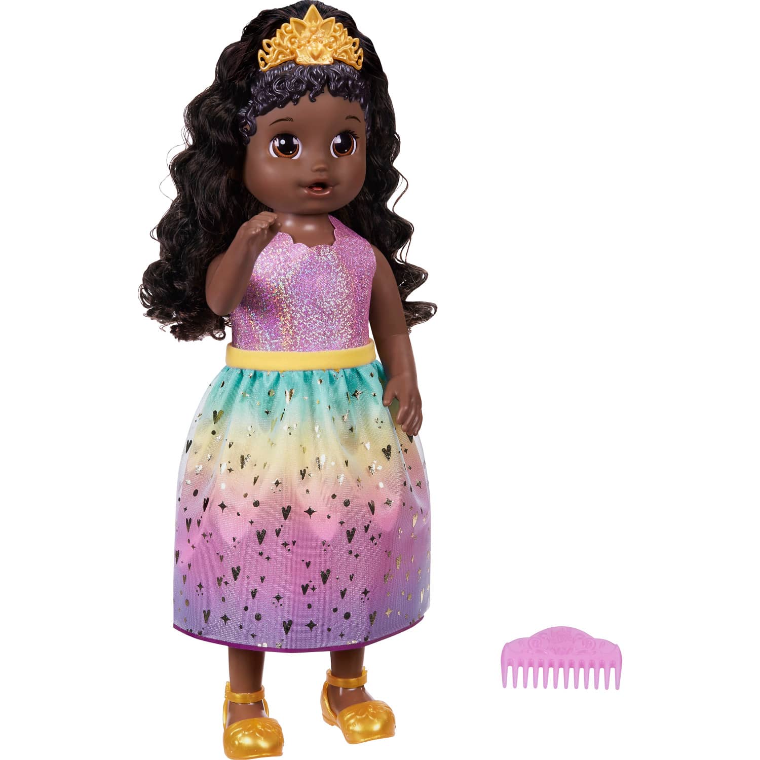 - DRESSING-UP DOLL ACCESSORIES AND TIARA HAIR EXTENSION: children aged 3 and up can place the tiara on the baby doll s head and style her brushable hair. Complete the royal transformation with her shimmery princess skirt