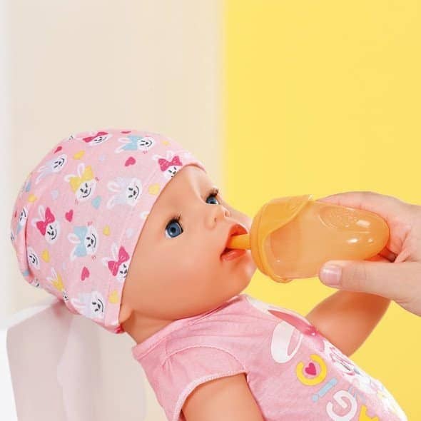 The lid of each of the colourful bottles looks like a real baby teat. If you take the cap off, you will find the drinking pin underneath, which you can use to feed BABY born.