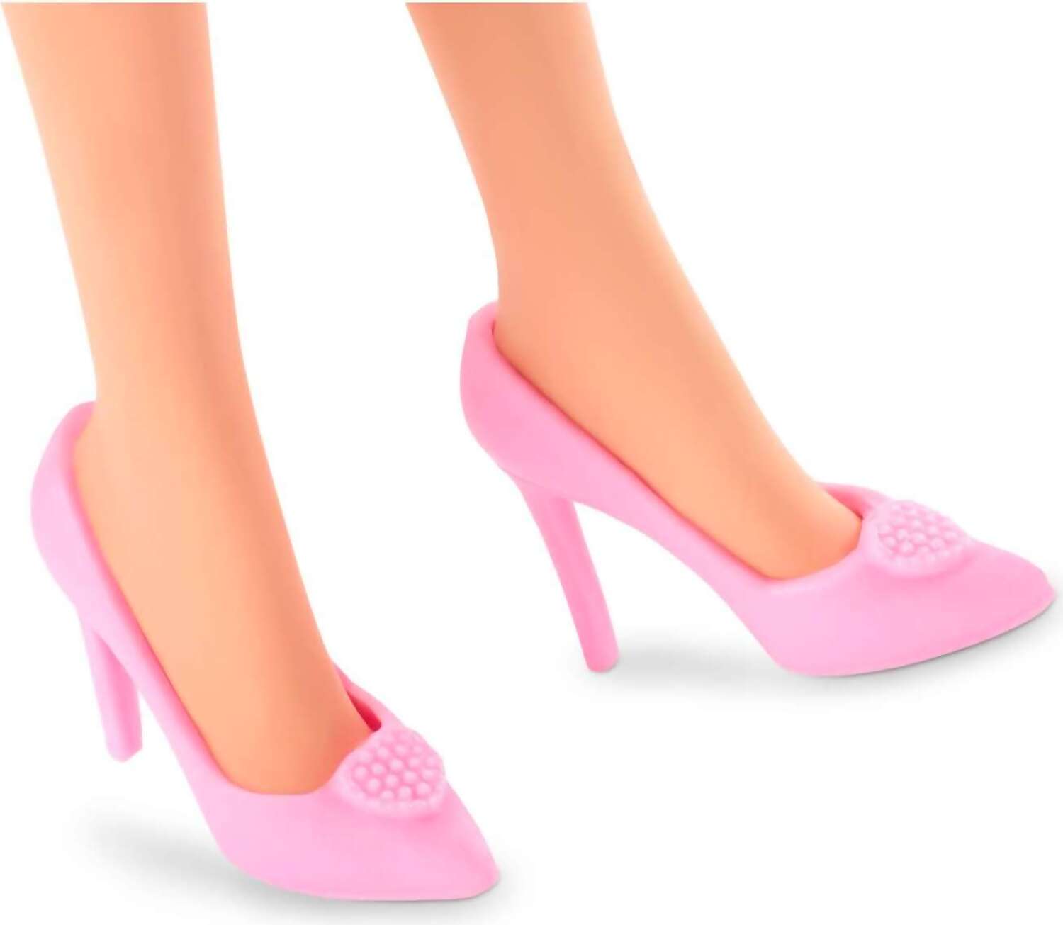 - She looks just like film Barbie with her daisy chain necklace! An adorable pink bracelet and heart-adorned pink pumps complete her look.