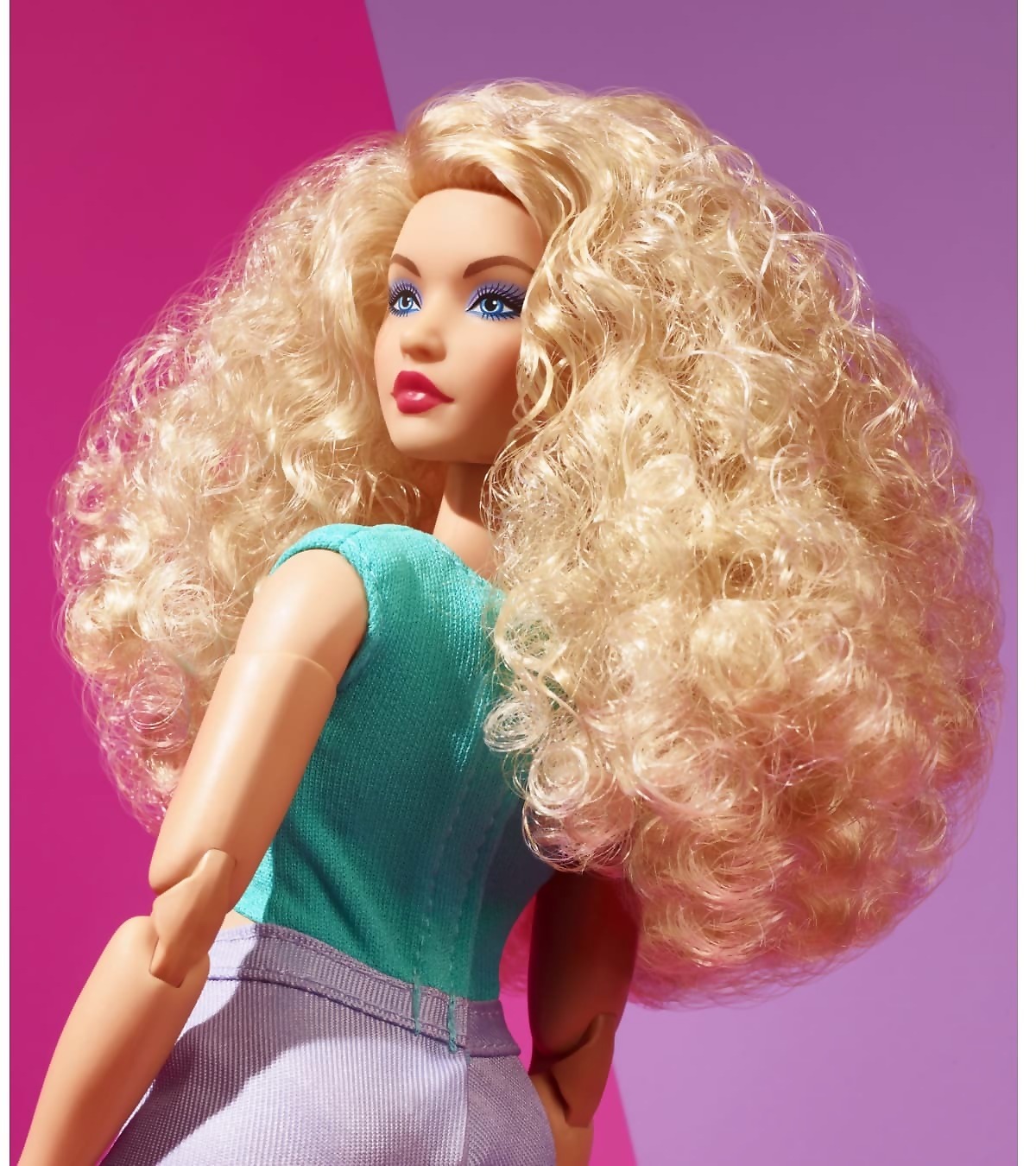 - Barbie® doll’s face is framed by stunning, voluminous blonde curls! A beauty mark on her cheek complements blue eyeshadow and red lips.