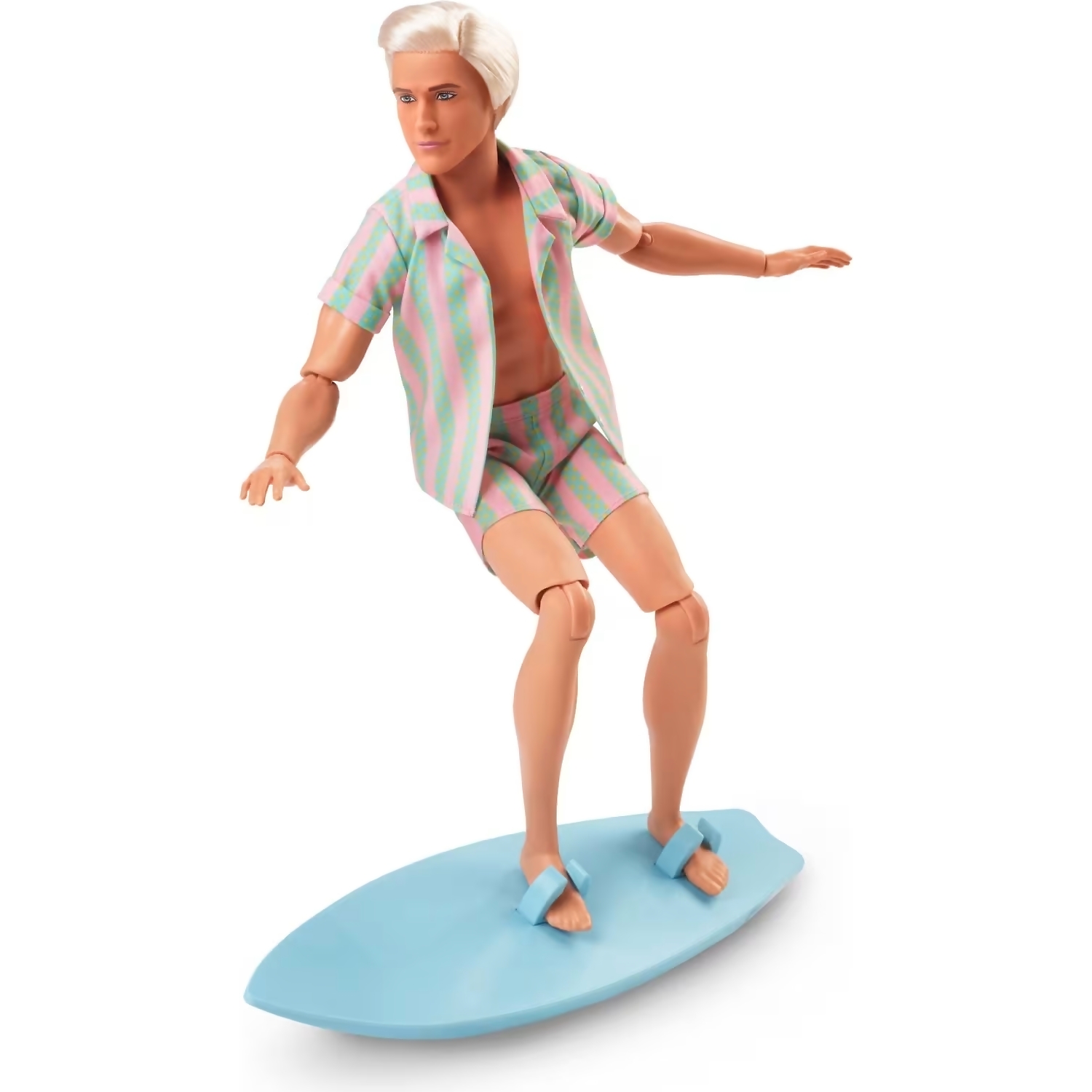 Greetings from Barbie Land! Inspired by Kens character in Barbie™ The Movie, this Ken® doll wears a beachy, striped matching set. With a surfboard in tow, hes having the best day ever in Barbie Land! Celebrating Barbie™ The Movie, this Ken® doll makes a great gift for fans and collectors alike. Doll cannot stand alone. Colors and decorations may vary.