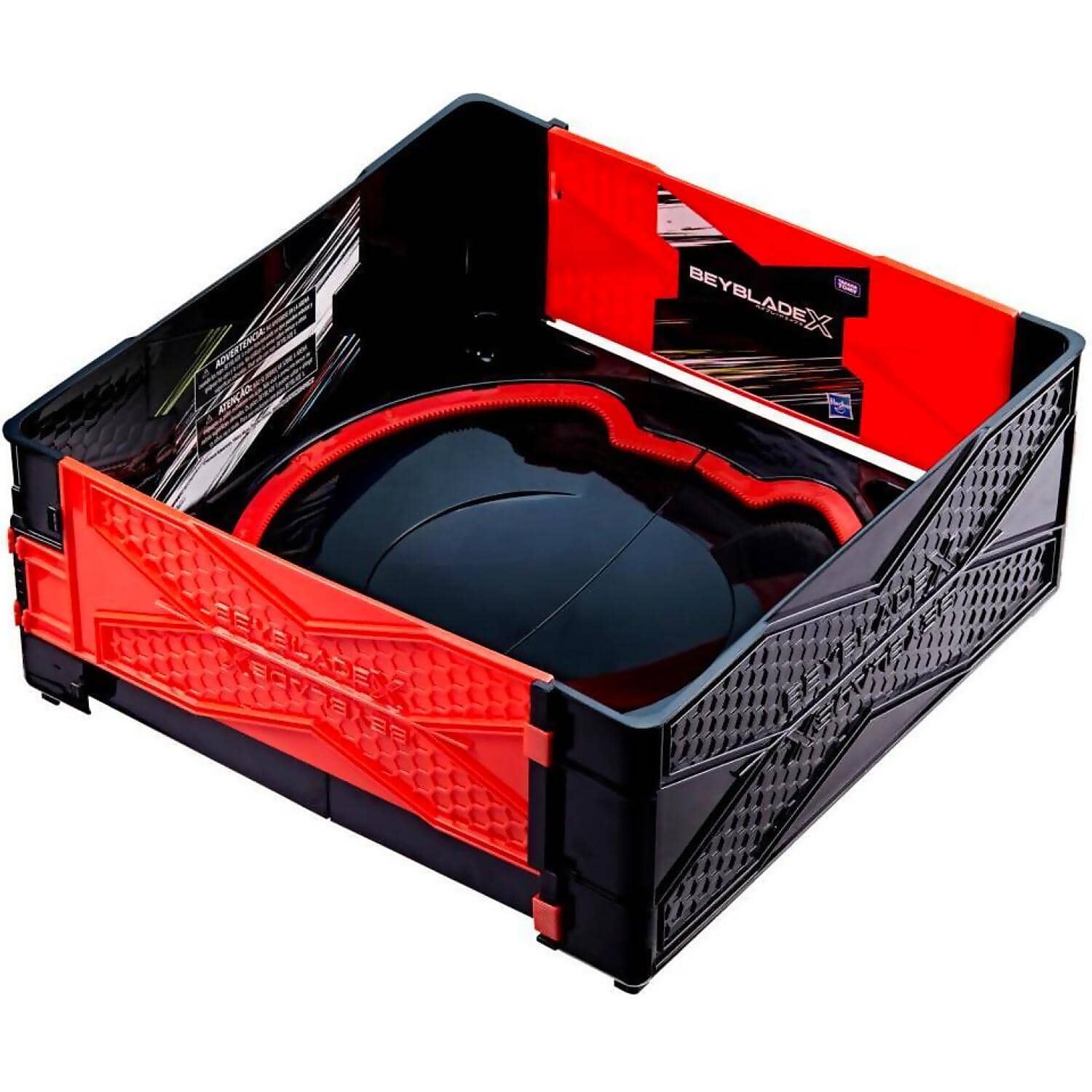 WARNING: Only use BEYBLADE X tops with a BEYBLADE X Beystadium. DO NOT LEAN OVER STADIUM when tops are in play. Do not use stadium on tables or other elevated surfaces. Tops may bounce up and hit eye and face.