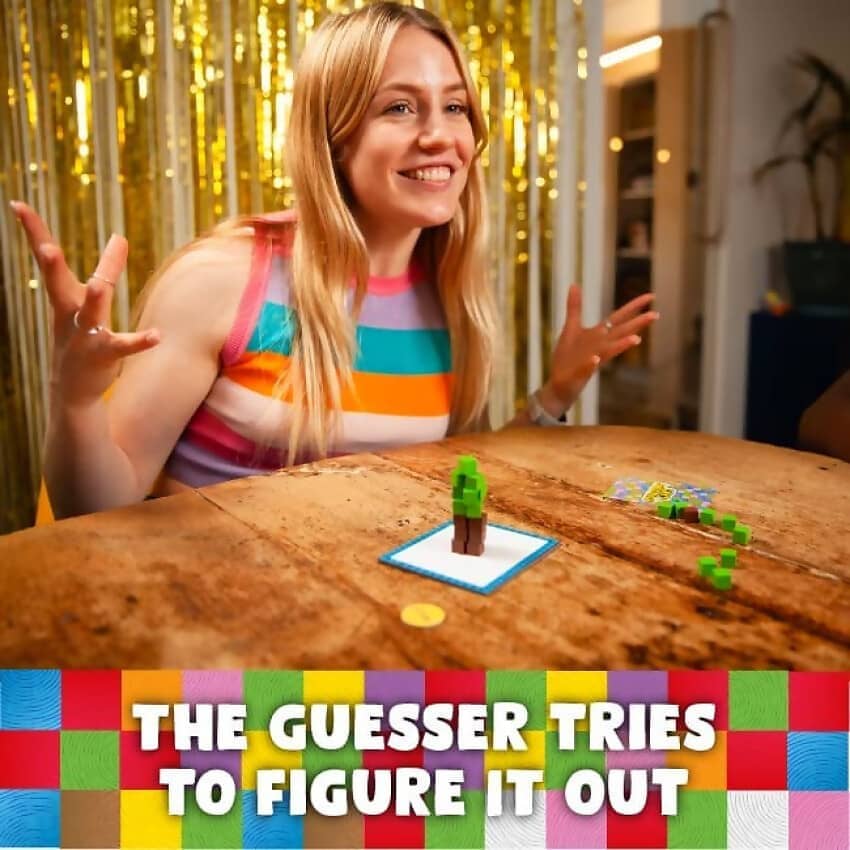 Simply choose one of the secret objects written on your card and grab some blocks. If another player guesses what you’ve made, you both get points. If you can be the best builder and complete that round’s big challenge, you will also collect a highly-prized bonus point just the thing to get your playing piece racing around the score track.