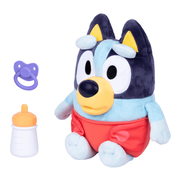 Say hello to the Cuddle & Care Baby Bluey! This electronic plush toy is 11 (28cm) tall, the perfect size for cuddling. Baby Bluey includes 2 accessories – a baby bottle and pacifier. Baby Bluey even has a plastic molded muzzle so your child can place them into Bluey’s mouth.