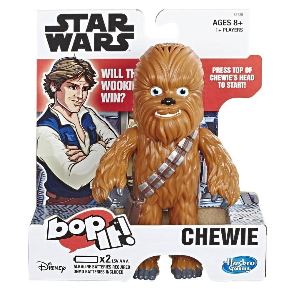 Twist it, pull it, and take the game out of this galaxy with this Chewie edition of the Bop It. game. The Bop It. Star Wars Chewie Edition game features gameplay like the original, but with an intergalactic twist. This electronic game commands players to take 3 actions in the voice of Han Solo, and they need to respond correctly and as quickly as possible. If a player gets it right, they get another chance, but if they don’t — they’re out. The commands get faster the longer they continue, and players will hear the sounds of Chewbacca (and some funny phrases by Han Solo) as they play. The game unit features 2 modes: Solo and Pass-it, so kids can play alone or with friends. Don’t let the Wookie win. Copyright and TM Lucasfilm Ltd. Hasbro Gaming and all related terms are trademarks of Hasbro. DESIGNED TO LOOK LIKE CHEWBACCA: The Bop It. Star Wars Chewie Edition game features original Bop It. gameplay featuring Chewbacca REAL SOUNDS OF CHEWBACCA: Star Wars fans can appreciate the Bop It. Chewie Edition game as it features the real sounds of Chewbacca VOICE OF HAN SOLO: The Chewbacca electronic game unit also features the voice of Han Solo; hear laugh-out-loud phrases FAST-PACED ELECTRONIC GAME FOR KIDS: The game unit commands players to take 3 actions in a random order, and they need to respond fast and accurately to win; Bop It, Twist It, Pull It PLAY SOLO OR WITH MULTIPLE PLAYERS: The electronic game unit Includes Solo and Pass-it modes, so kids can play the Bop It. game on their own or in a group