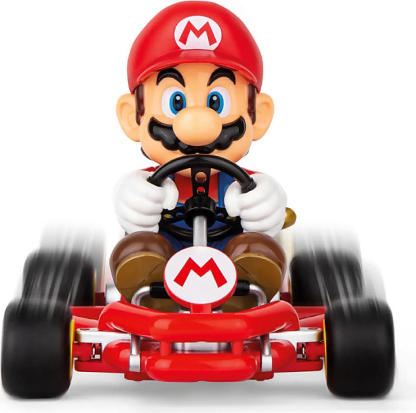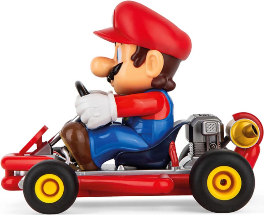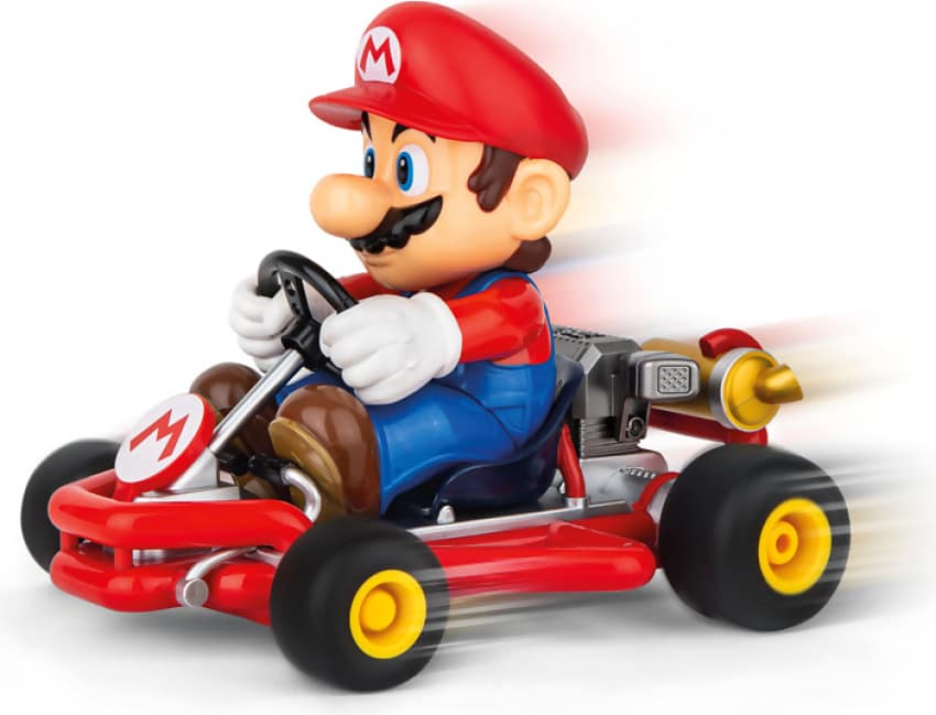 ‘- Carrera RC Mario Pipe Kart – Carrera RC Action – Join Mario in the Pipe Kart for red-hot racing – Length approx. 21 cm – Age 6 and upwards Mario Kart Action at home The original Nintendo reproduction license ensures this lovingly-crafted hero is the spitting image of his digital alter ego. Mario earns his place at the top of the podium at top speeds of up to 9 km/h against up to 15 other drivers. Enjoy up to 30 minutes of searing race action before it’s time to use the USB cable included in the box to fully recharge the 3.2 V 320 mAh LiFePo4 battery in just 50 minutes. Full function control technology makes Mario easy to drive for enthusiasts aged 6 and up. Race with Mario and place the Mushroom Cup in your trophy cabinet!