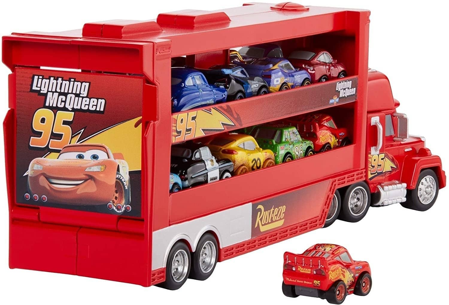 Each Cars transporter truck has an extendable ramp to drive a diecast mini vehicle. Transporter fits 18 minis! Comes with one metal Mini Racer vehicle.