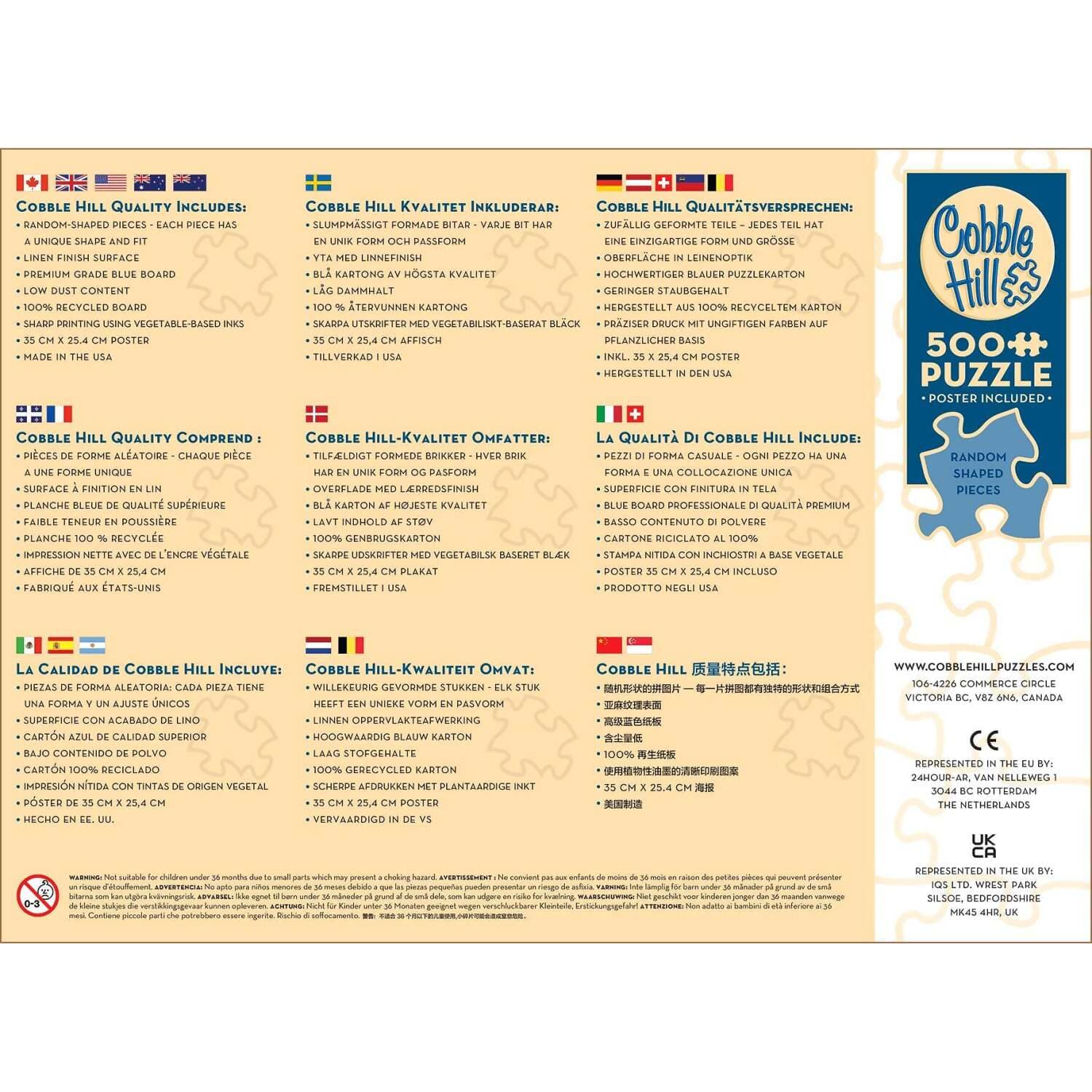 A beautiful 500 piece wildlife puzzle. Cobble Hill was founded in 2005 with a desire to bring loving, whimsical, high-quality images to puzzle enthusiasts around the world! Our puzzles have been described as nostalgic, lively, endearing, sweet, durable, and fine quality.