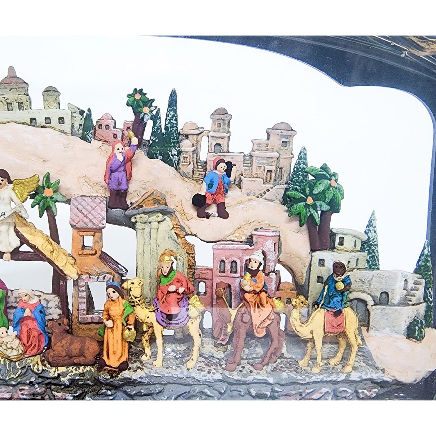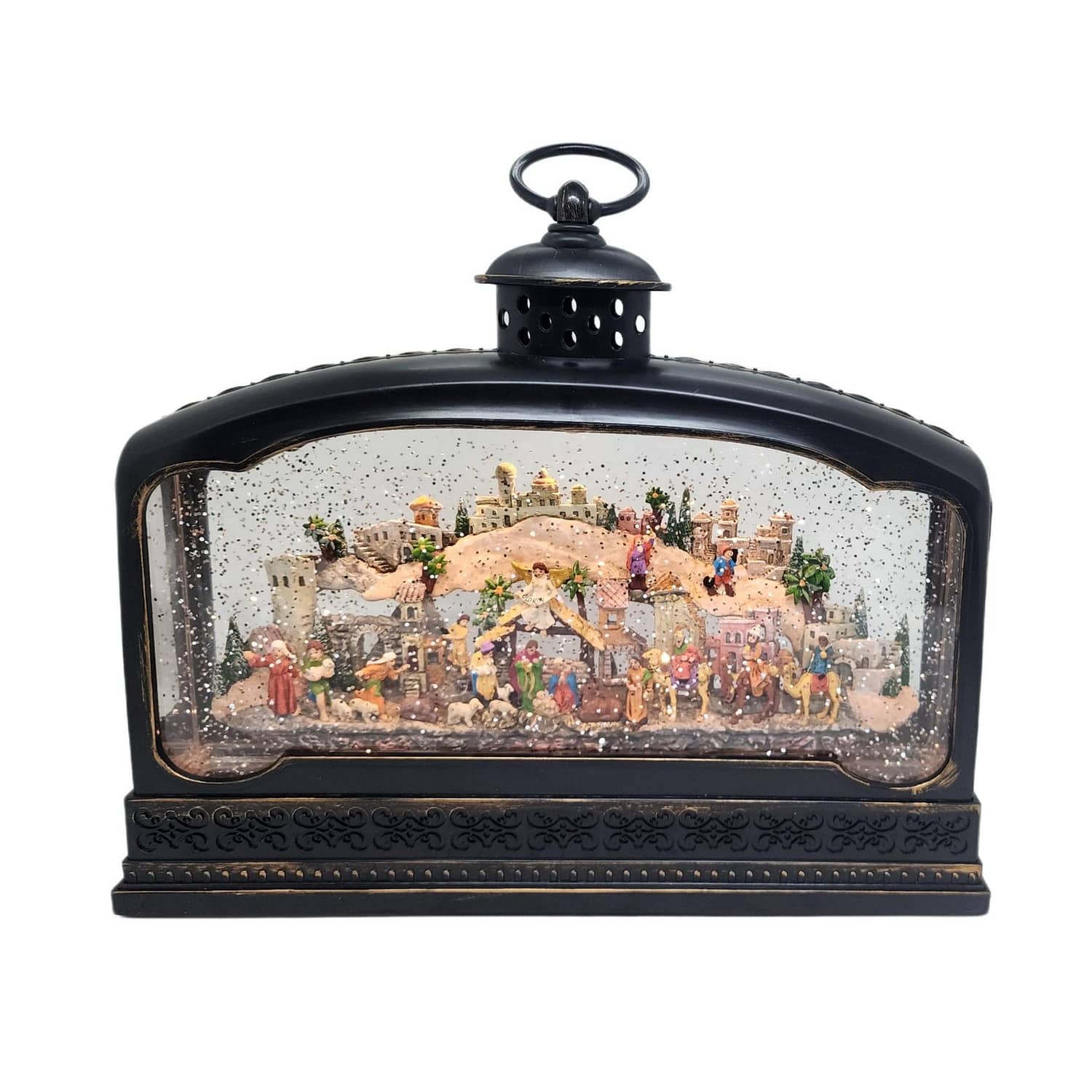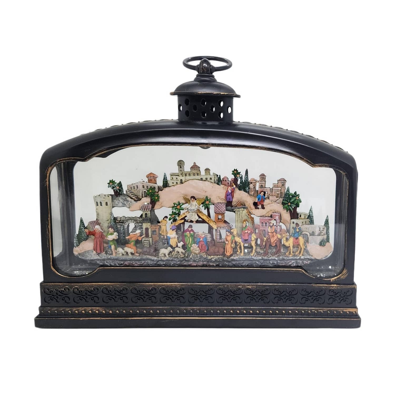 This stunning product features a full Bethlehem Nativity Scene inside a wide brass lantern. The scene is beautifully illuminated by an LED light, creating a warm and inviting atmosphere. The swirling motion inside the lantern brings the scene to life, making it a captivating addition to your holiday decor.