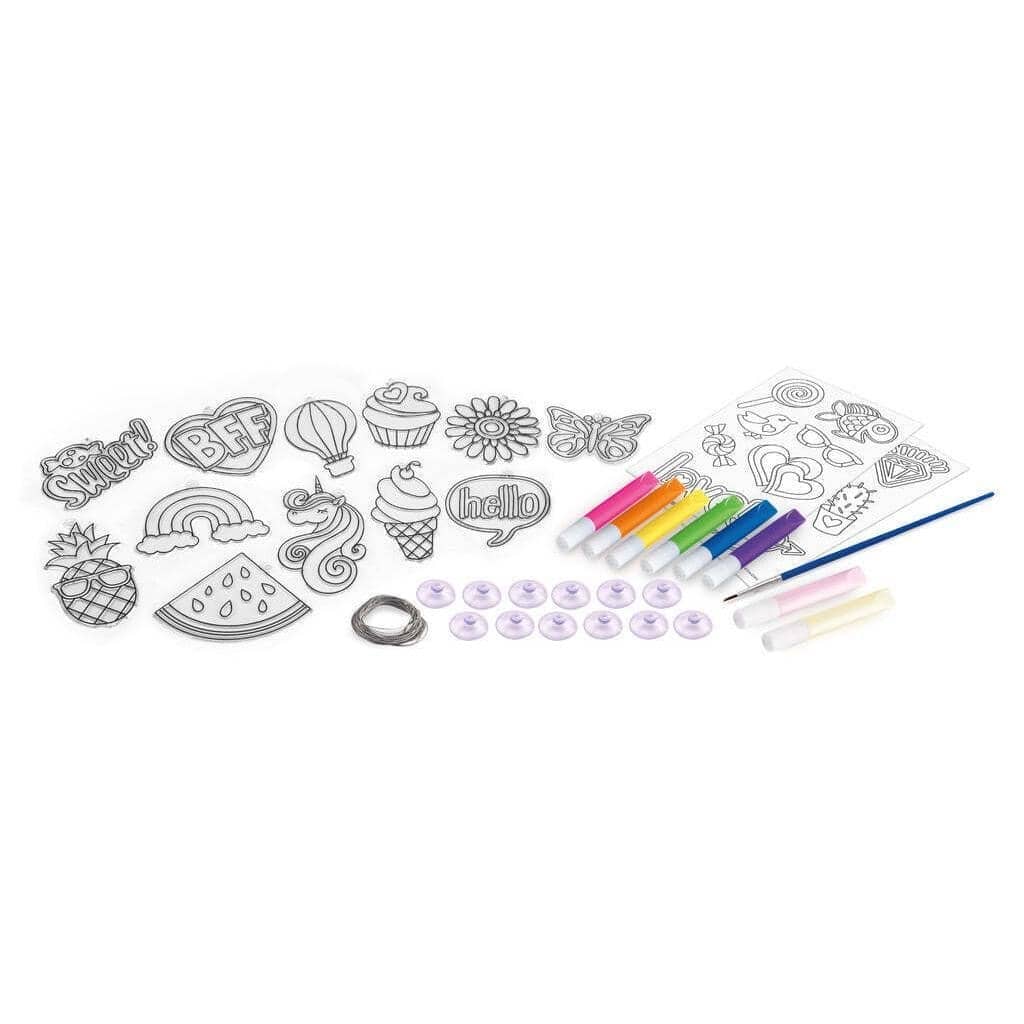 Styles/colours may vary.Includes:12 Plastic Suncatcher Designs, 12 Suction Caps, 1 Skein Silver Cord, 2 Design Templates.2 Tracing Sheets, 2 Colour-changing Window Paints (approx. 10ml each).6 Window Paints (approx. 10 ml each), 1 Paint Brush, Instructions.
