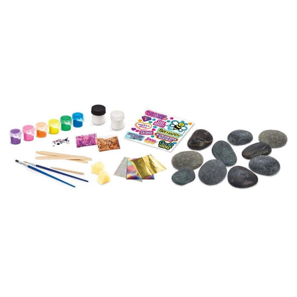 Included: Assorted River Rocks, 6 coloured paints, 1 white paint, 1 clear coat, 2 brushes, 3 mixing sticks, 1 rubbing stick, 2 sponges, 1 sheet stickers, 3 sheets foil, 2 packets sequins, 1 bag assorted gems, instructions.