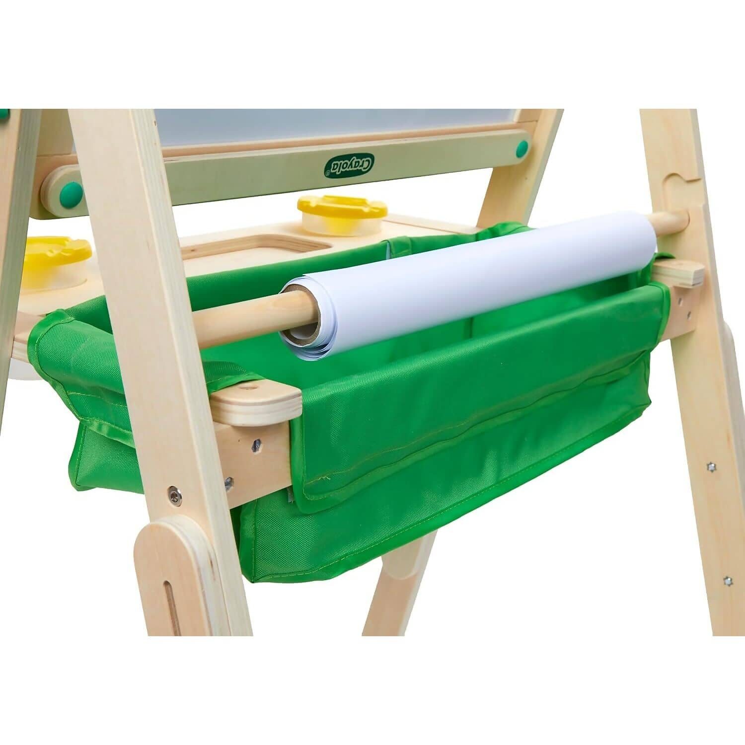 The easel includes ample storage with a fabric tray beneath for easy access to supplies, a paper roll and a wooden shelf for additional materials. Utility cups are included to keep everything organised.