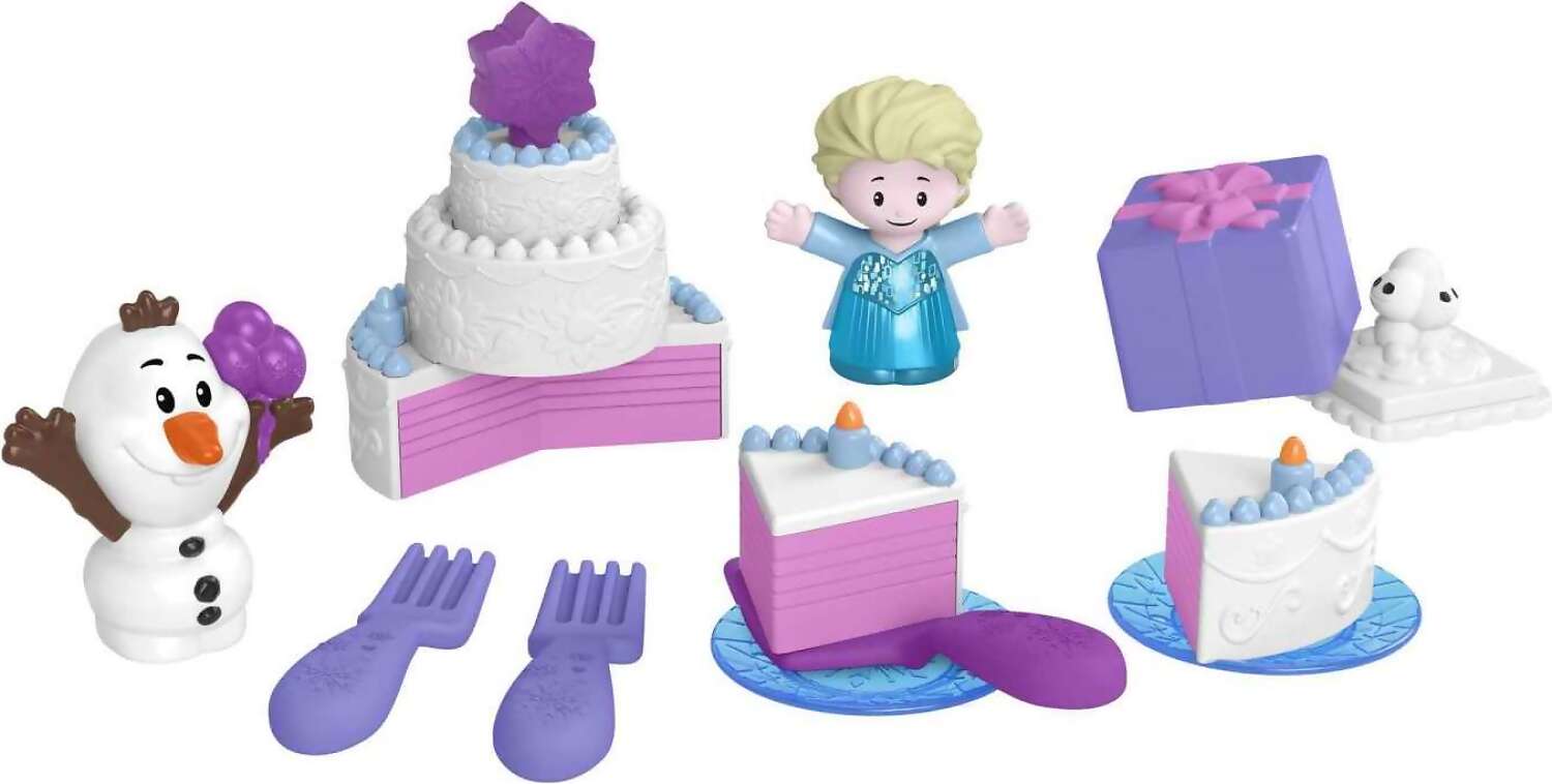 • Little People® birthday party playset featuring Disney Frozen characters Elsa and Olaf for toddler-friendly pretend play