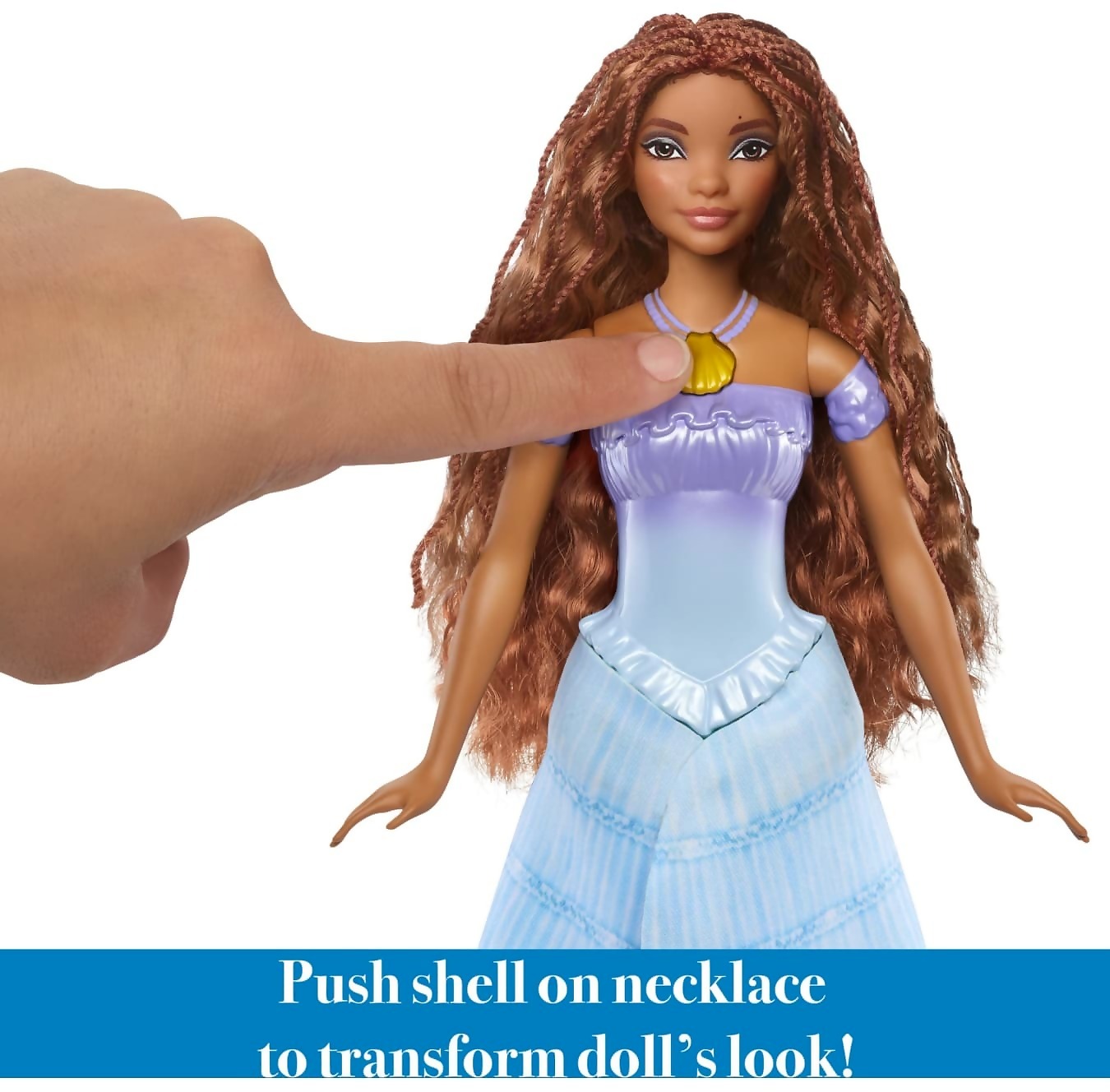 Make a splash with Disney’s The Little Mermaid Transforming Ariel doll from the exciting theatrical release. Simply push her shell necklace to see her transform from human to mermaid! Her signature blue dress opens to become a beautiful, multi-colored mermaid tail. The posable fashion doll features long hair for endless styling fun. Fans can collect all The Little Mermaid dolls and create their own adventures above or below the waves. Each doll sold separately, subject to availability. Doll cannot stand alone. Colors and decorations may vary.