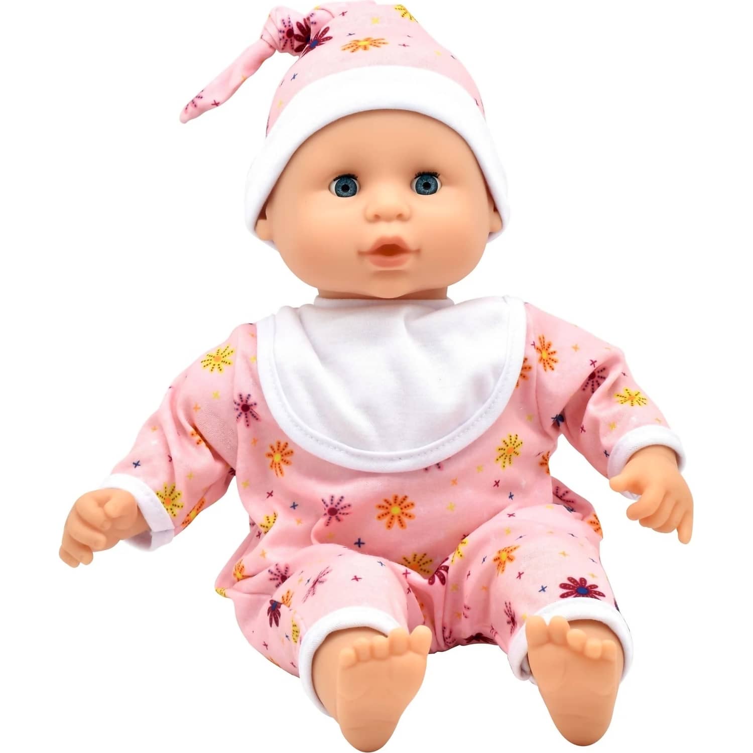 Dolls World Baby Joy is a 38cm soft-bodied doll designed to bring comfort and imaginative play to young children. She wears a charming floral romper with a matching hat, giving her a sweet and realistic look. With her sleeping eyes and bean-filled bottom, she sits naturally and feels just like a real baby in little arms.