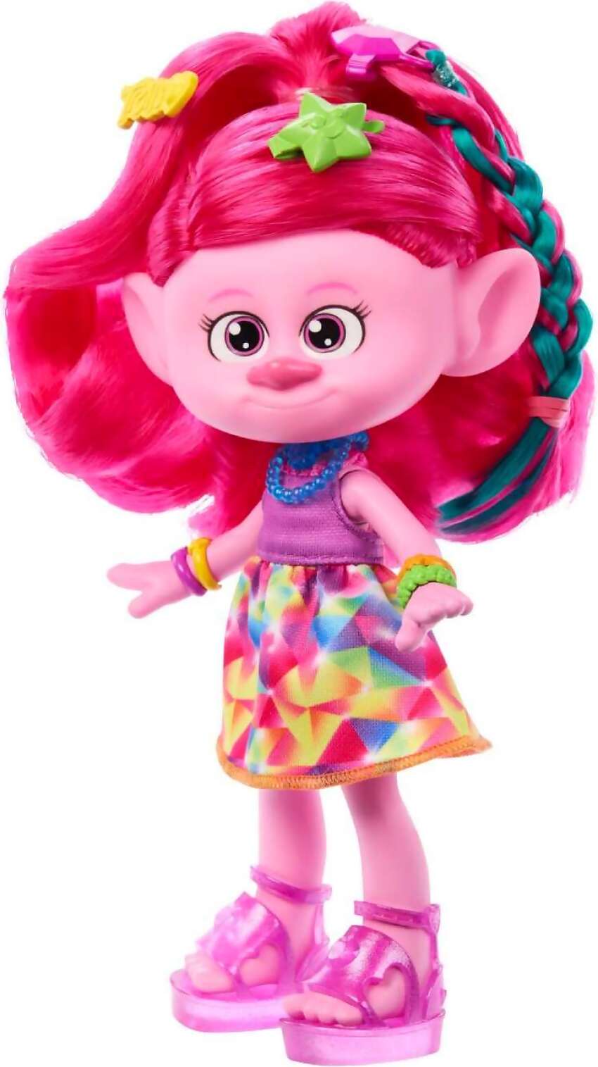 Includes 1 DreamWorks Trolls™ fashion doll wearing removable fashion, shoes, and 2 bracelets, plus 1 comb with shimmer gel tube, 3 hair extensions, 2 additional bracelets, 1 necklace, and 13 hair accessories.