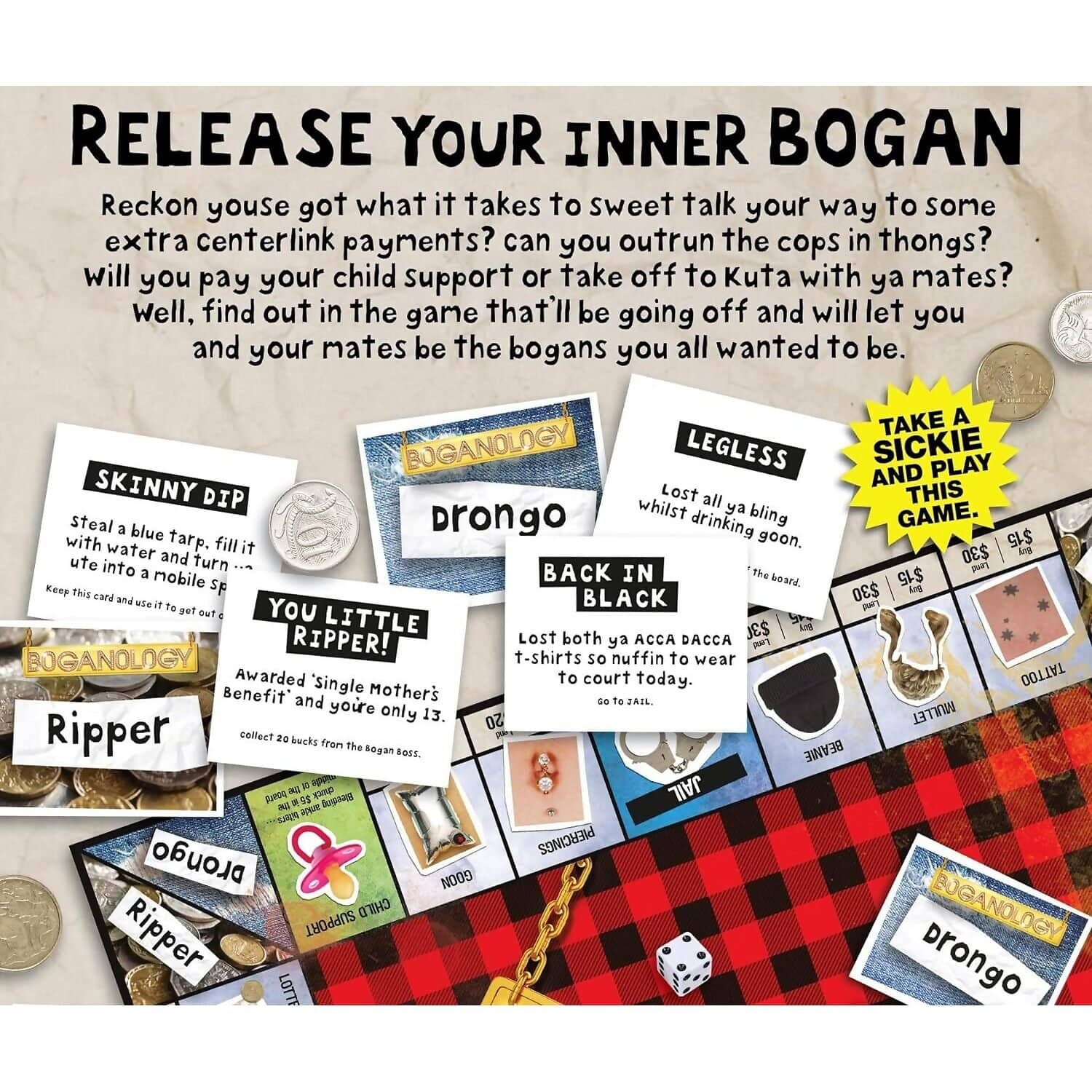 All these questions and more can be answered in this exciting game that lets you and your friends experience the bogan life you’ve always wanted. Remember, the Ripper and Drongo cards add an extra layer of fun to the gameplay. So get ready, roll the dice, move your bogan, buy items, lend them to your mates, and let the bogan adventures begin!