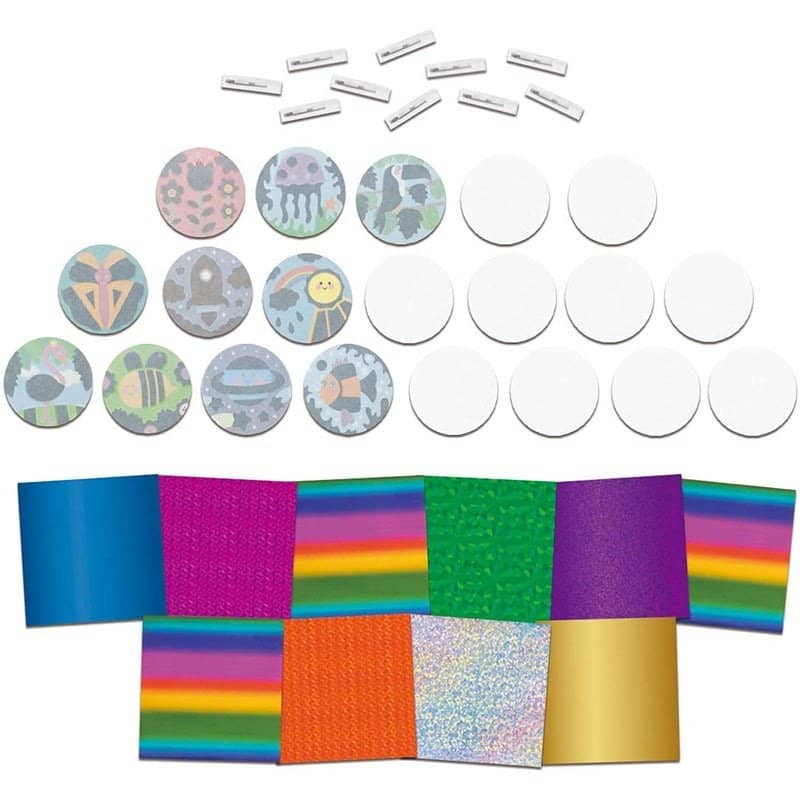 Simply rub the foil over the adhesive sections of your sticker to transfer your chosen foil. Stick your foil creation onto a badge backing before adding a badge pin to complete a super sparkly badge.