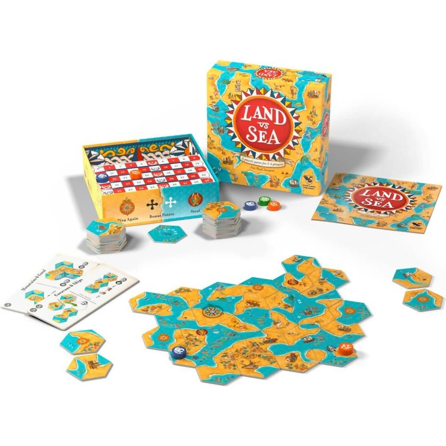 The strategy of the game involves careful tile placement to score from as many land or sea areas as possible, while minimising your rivals’ opportunities to score from the tiles you play. Watch your rivals’ possible plays, and control tempo strategically with Play Again and Steal tiles. Look out for opportunities to score valuable bonus points in your and your rivals’ areas. Carefully select tiles as you replenish your hand to prepare for your next turn.