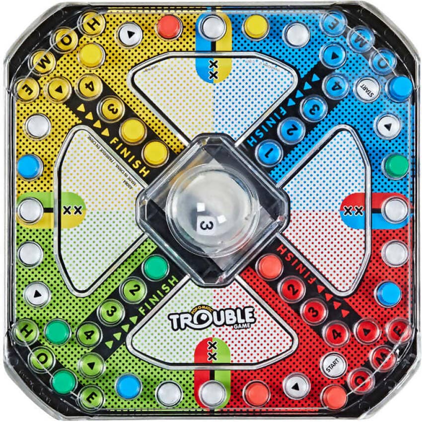 The Trouble Game Pop-O-Matic is a classic race-and-chase board game designed for family fun. Players press the iconic Pop-O-Matic bubble to roll the die, moving their pegs around the board while avoiding setbacks. The first player to get all four pegs into the Finish Zone wins, making every round a thrilling competition.