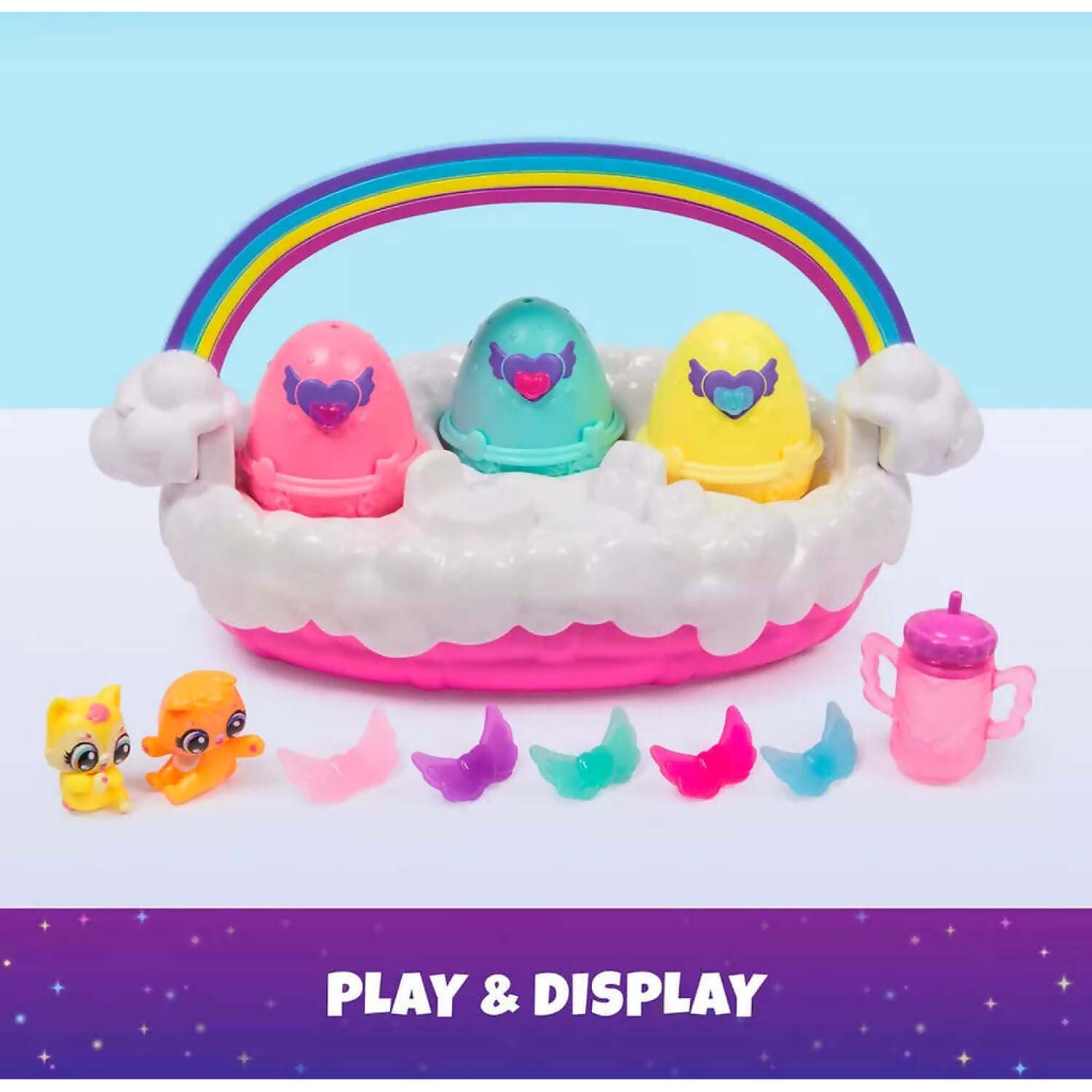 With your love and care, super cute Hatchimals Alive characters come to life. These self-hatching eggs hatch like real eggs when activated by water. Inside the basket, discover 3 Hatchimals eggs, a bottle and a sweet Kittingale and Foxstritch out-of-egg.