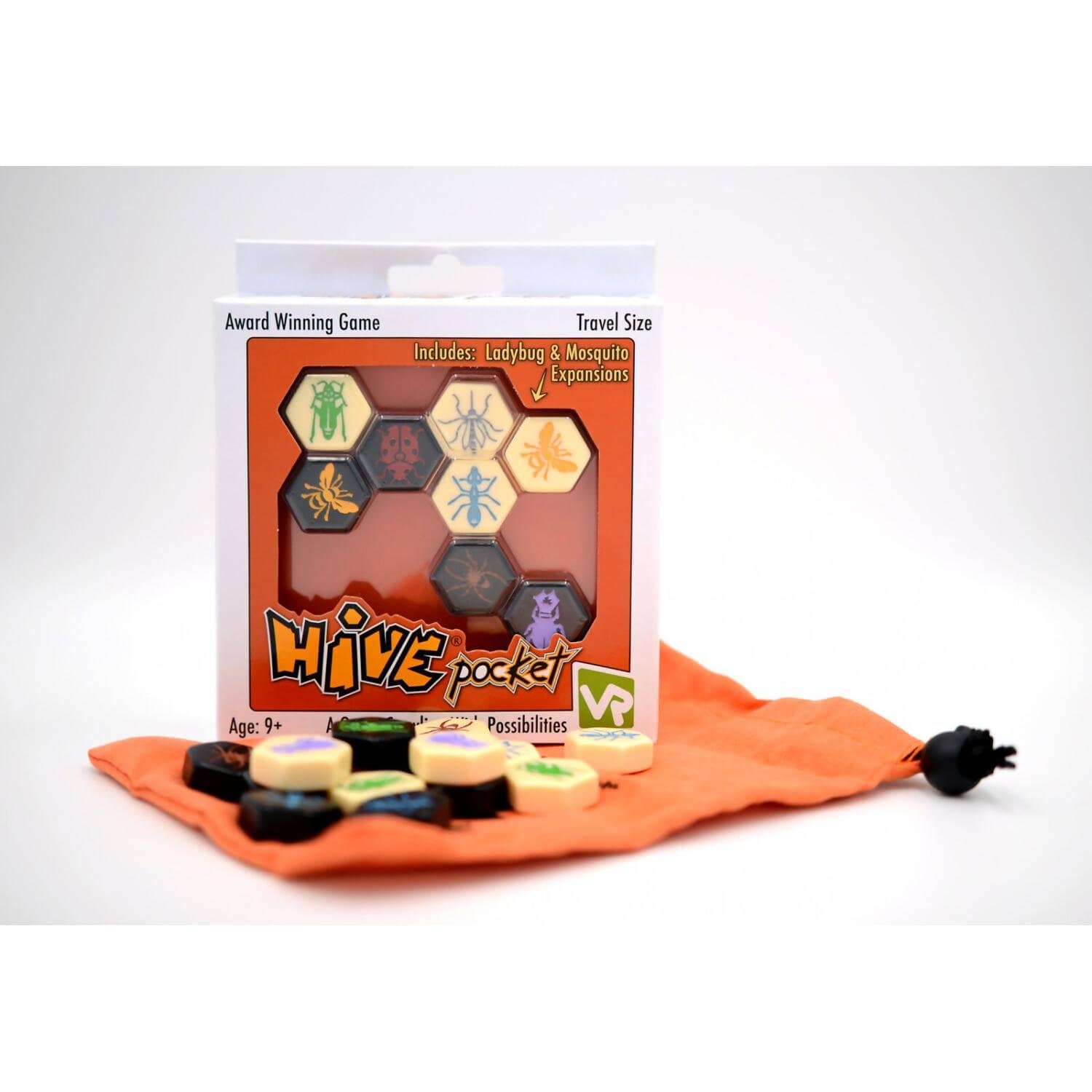 Hive Pocket® is the travel version of the award-winning game, Hive! This version includes 26 beautifully crafted Hive pieces, a drawstring storage bag and two expansions to the game: ‘The Mosquito’ and ‘The Ladybug’.