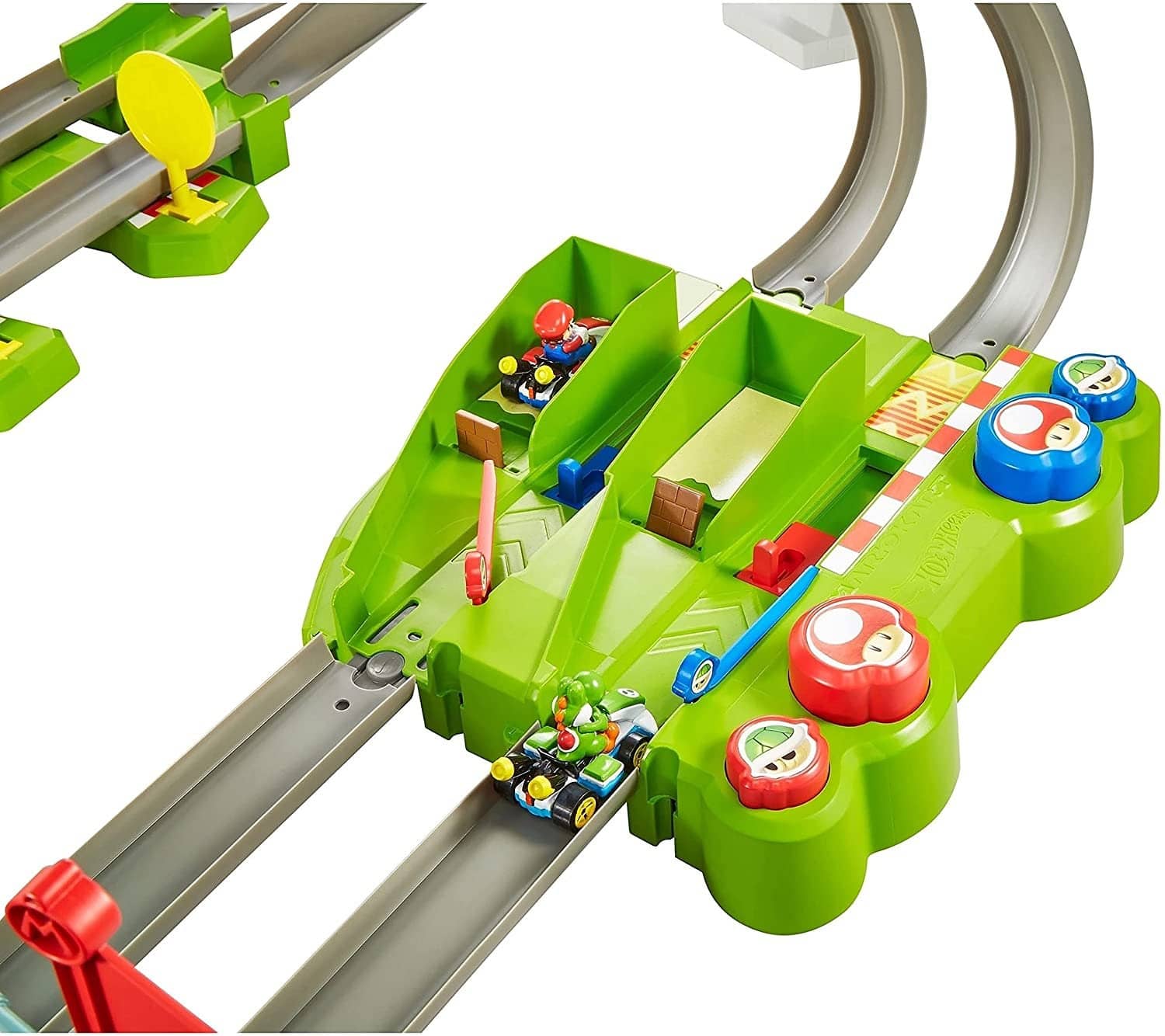 • Load Mario and Yoshi karts into the launchers and turn on the booster for racing action around the track and through the inverted loops!
