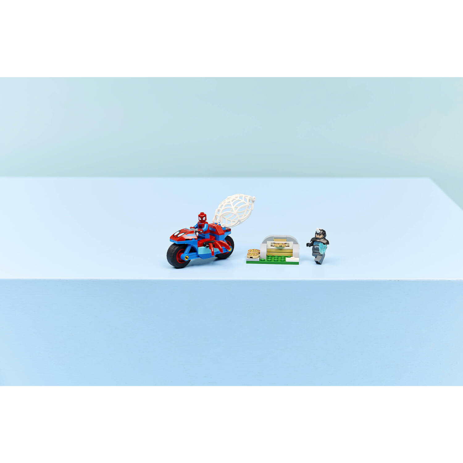 - MARVEL ACTION ON WHEELS – Kids help Spidey retrieve a stolen blue gem, dodge flying pizzas launched from Rhino’s pizza oven shooter, and capture Rhino in a giant spiderweb trap