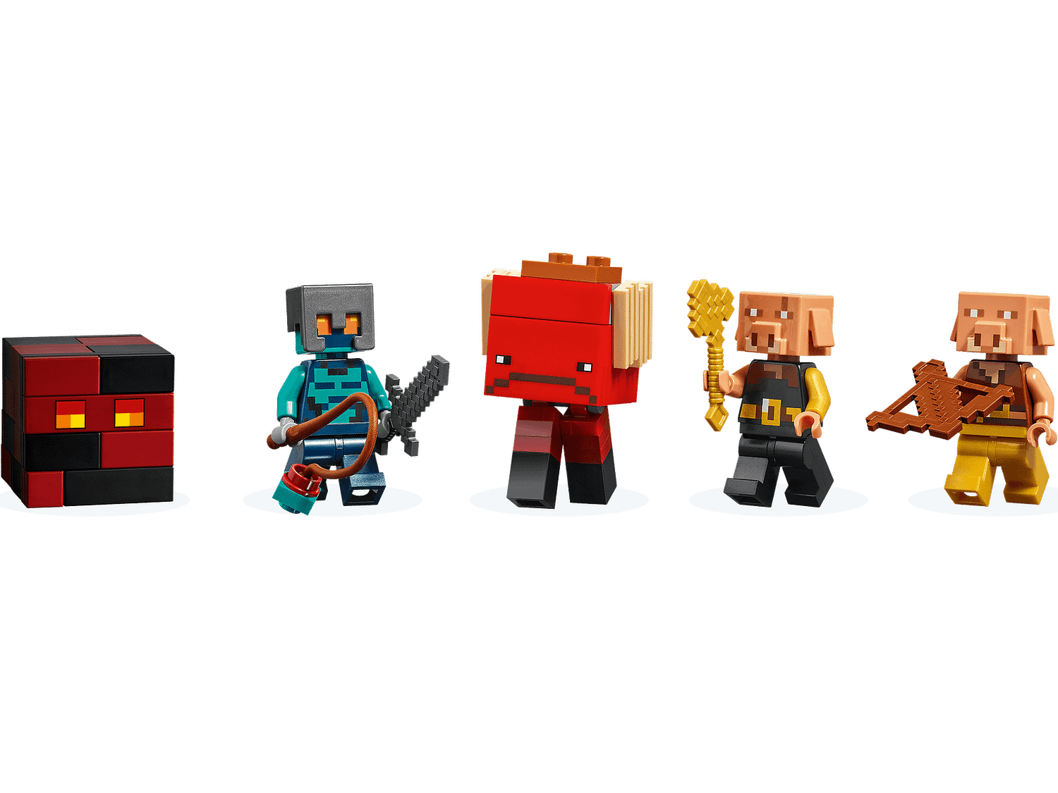 - Characters from the game – The set includes a large cast of Minecraft® characters: a nether adventurer, magma cube, piglin brute, piglin and a strider, plus a host of features and accessories