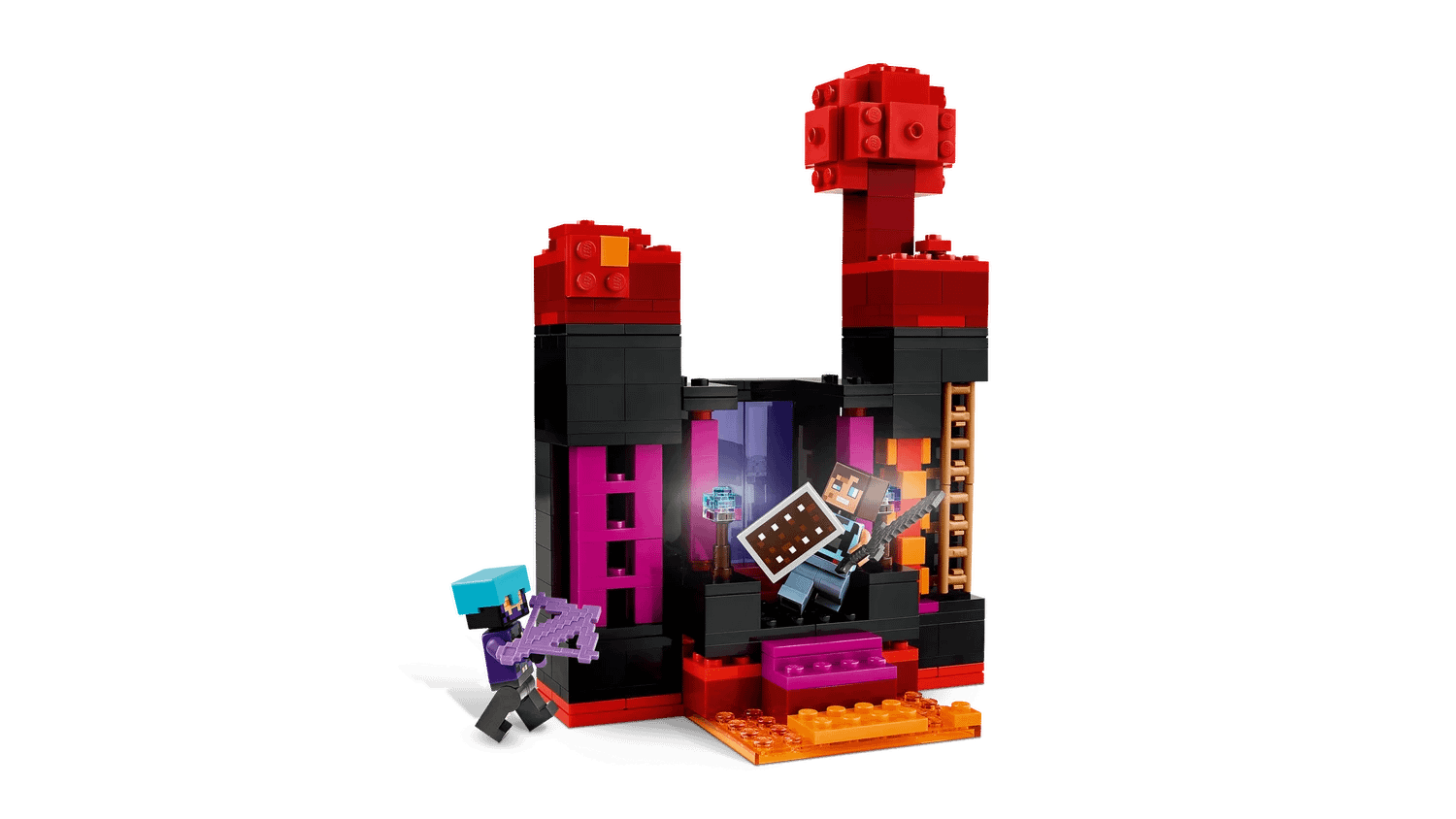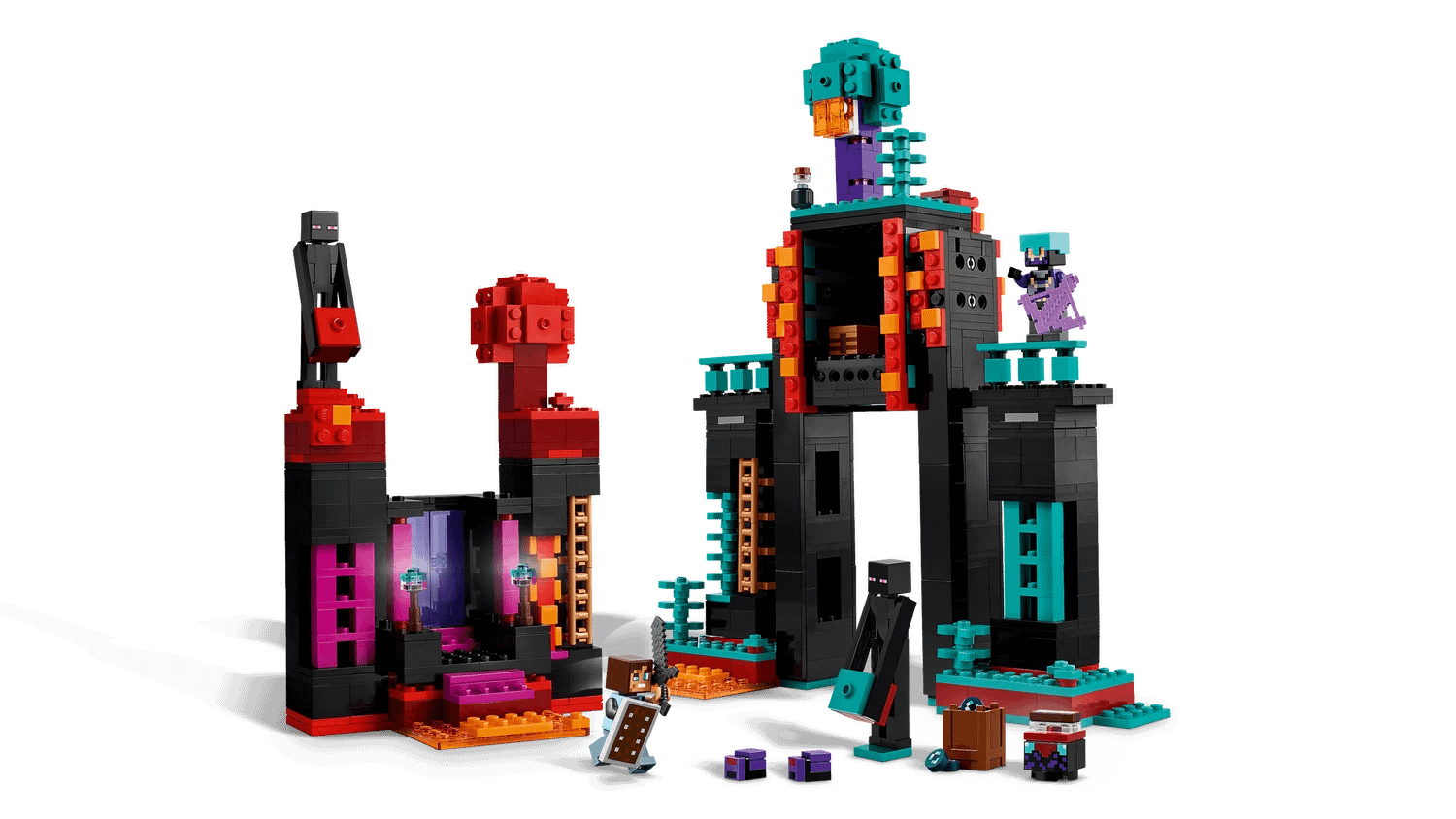 The primary build is an Enderman-shaped tower with a Nether portal in its head, a balcony on each shoulder and 2 rooms containing a crafting table, an enchanting table and a storage box for Ender pearls. Ladders provide access up the legs, the posable arms are fully articulated, and outside are elements of the warped forest and crimson forest biomes. The set features a Dimensional Defender, Realm Raider and 2 Enderman minifigures, plus 2 Endermite mob figures. Weapons include a Minecraft crossbow and netherite sword and shield. The Enderman Tower model can be rebuilt into 2 colour-coded fortresses, which is great for PvP (Player versus Player) action. Build with the LEGO® Builder app. Contains 867 pieces.