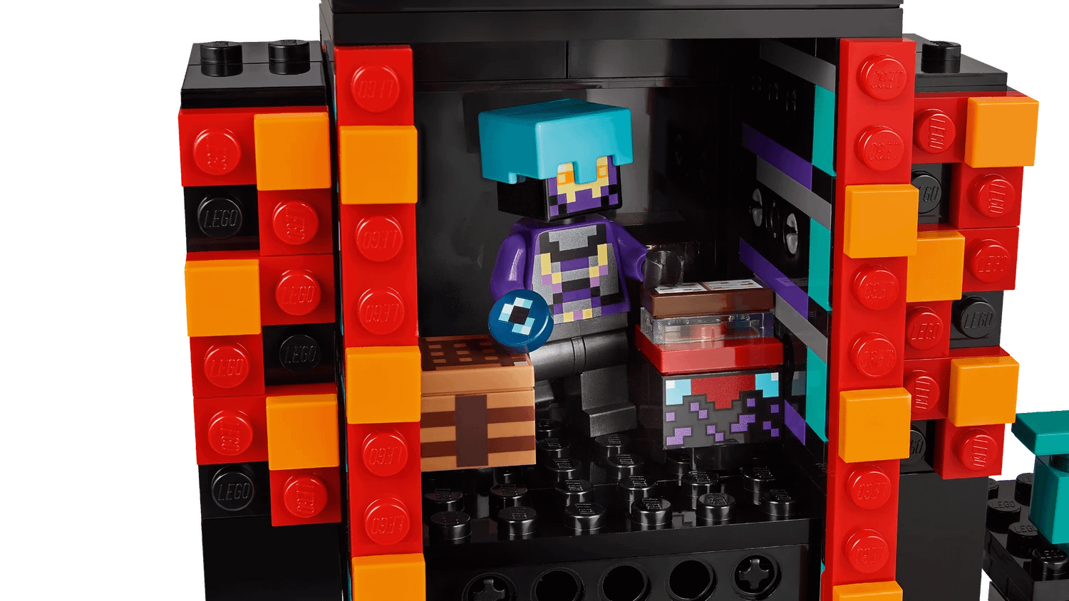 - Collectible video game figures – The set features a Dimensional Defender, a Realm Raider, 2 Enderman minifigures and 2 Endermite mob figures, and an enchanted crossbow and a netherite sword and shield