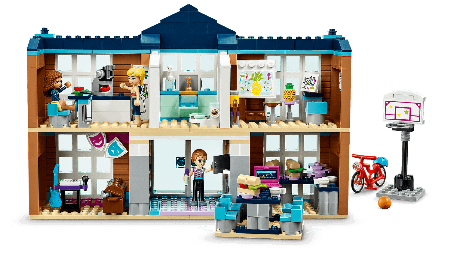 Over this model’s 2 floors are a science lab with a microscope and a ladybug to study, as well as art, drama and music classrooms, the latter containing a chest of creative dress-up kit and a selection of instruments. Kids can hang with friends in a canteen that comes with tables and food accessories. There’s even a hallway with lockers and a trophy display.
