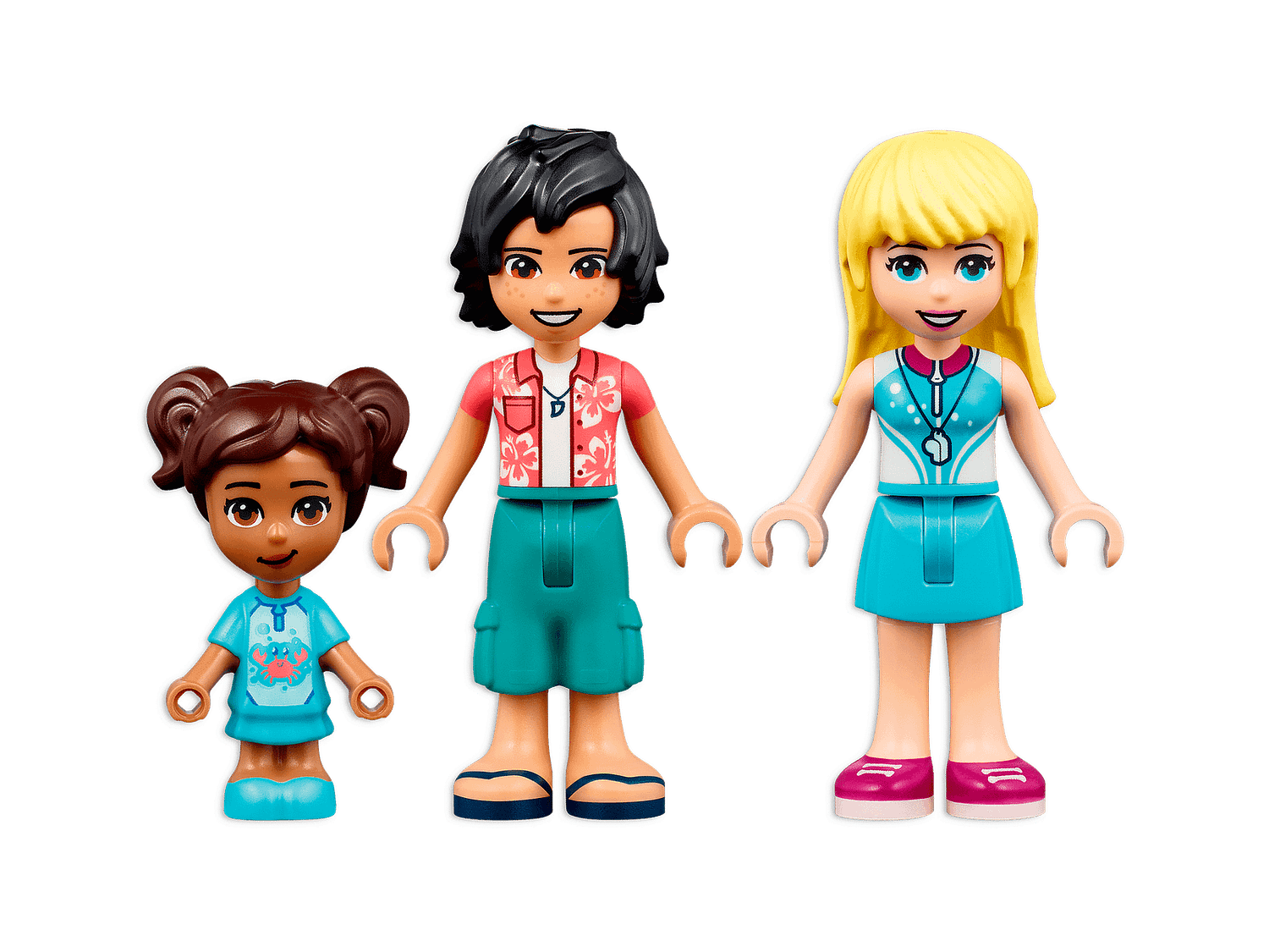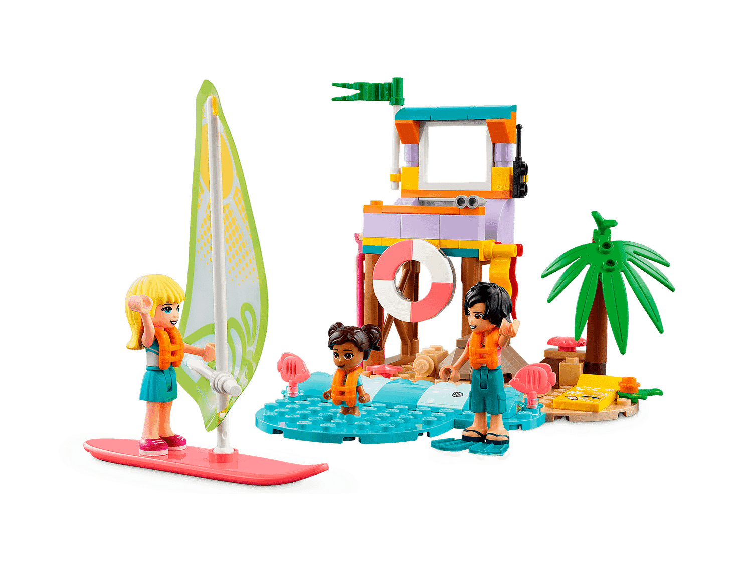 Kids join LEGO Friends Stephanie at the beach in her lifeguard tower, making sure everyone is safe. They can run the surf school, serve customers in the rental store, catch big waves on a surfboard, enjoy swimming in the sea with flippers and a snorkel, or have fun playing at the beach with the pail and shovel toys.