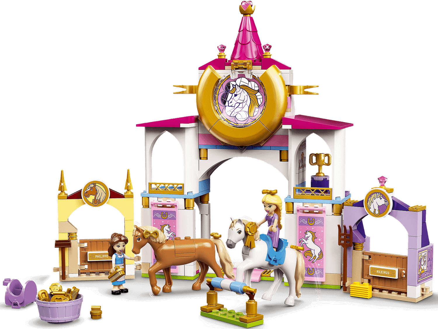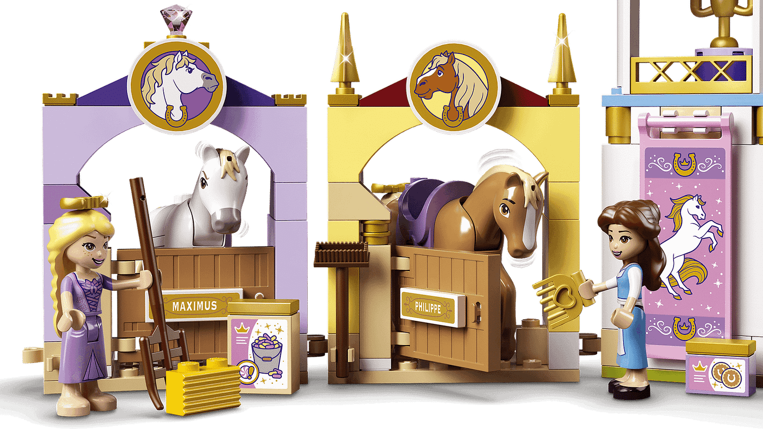 - 2 beloved characters, Disney’s Belle and Rapunzel, are ready for work and play in this top buildable toy. The awesome kit also includes 2 LEGO® horse figures, Maximus and Philippe.