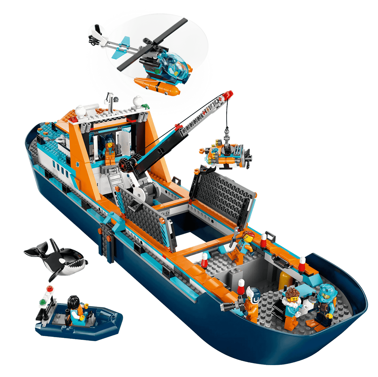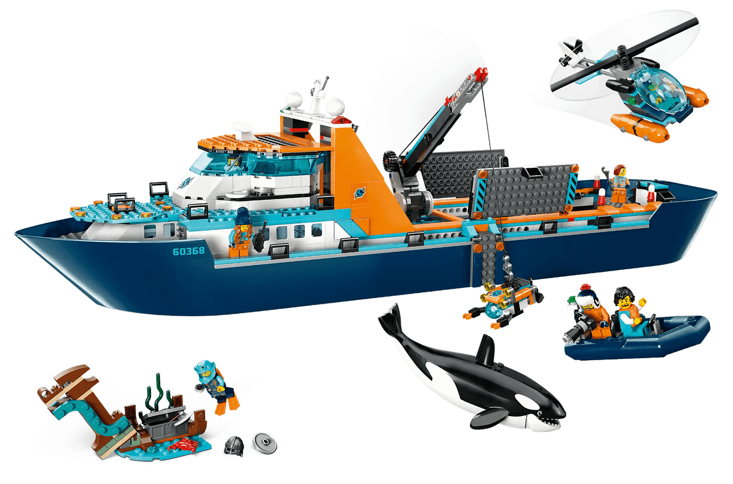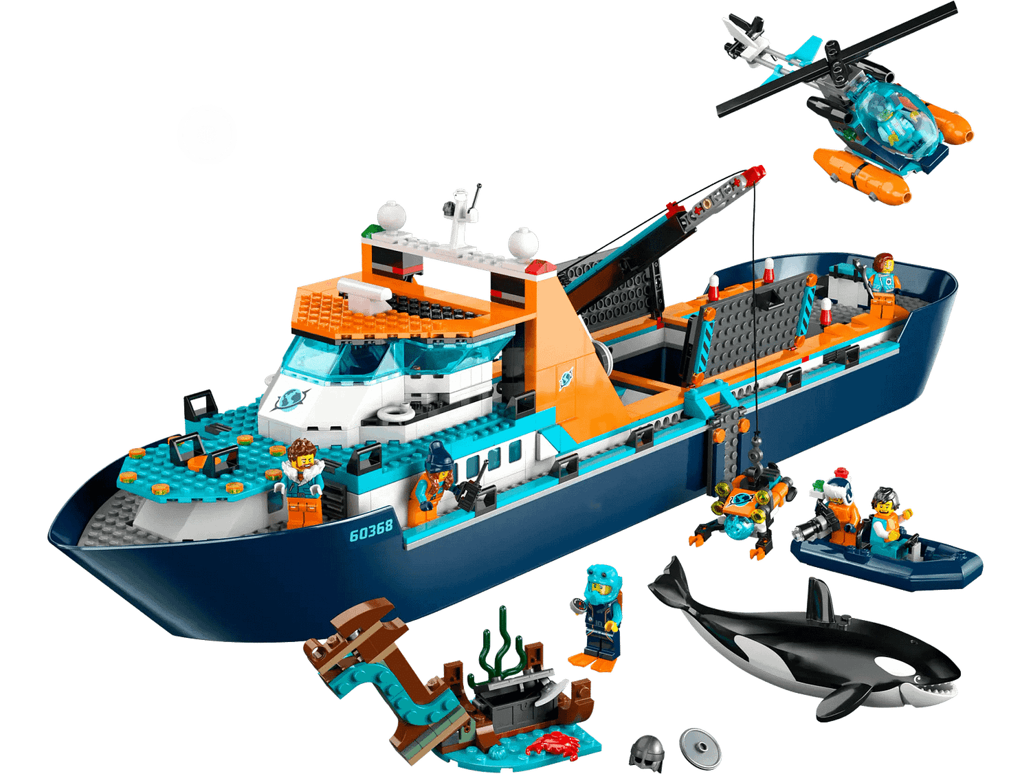 Fun adventures lie on the horizon with the mighty LEGO® City Arctic Explorer Ship (60368). This huge floatable toy boat is loaded with realistic detailing for imaginative exploration adventures. This premium playset also includes a helicopter, dinghy, underwater ROV sub and a Viking shipwreck, plus a treasure chest, 7 minifigures and an orca figure.