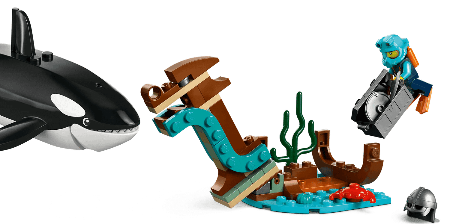 - What’s in the box – Everything kids need to build a toy exploration ship, helicopter, dinghy, ROV submarine and Viking shipwreck, plus 7 minifigures and an orca figure