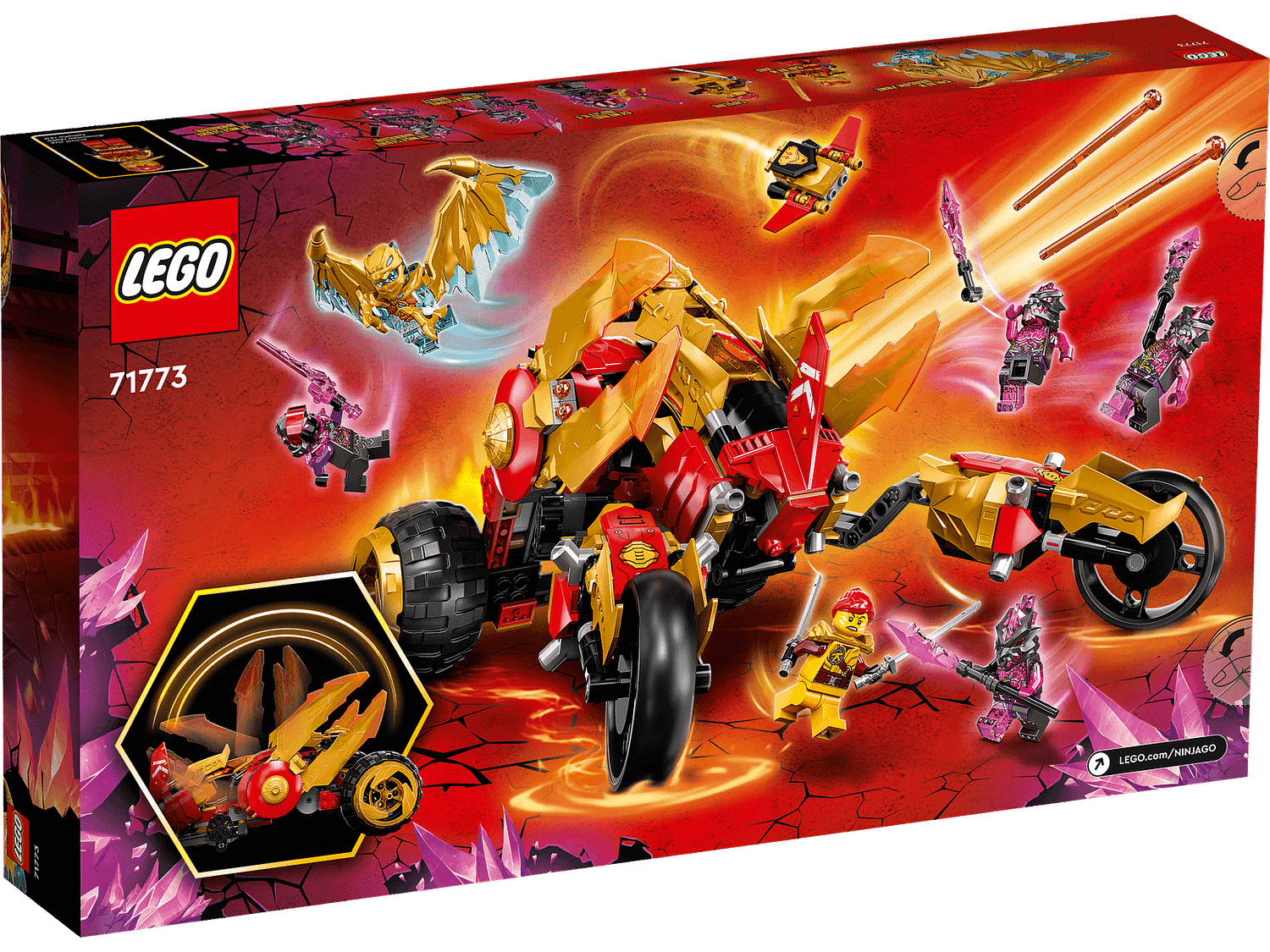 - NINJAGO® vehicle playset – Ninja fans can bring to life their favorite scenes from the NINJAGO: Crystallized TV series with this LEGO® NINJAGO Kai’s Golden Dragon Raider (71773) set