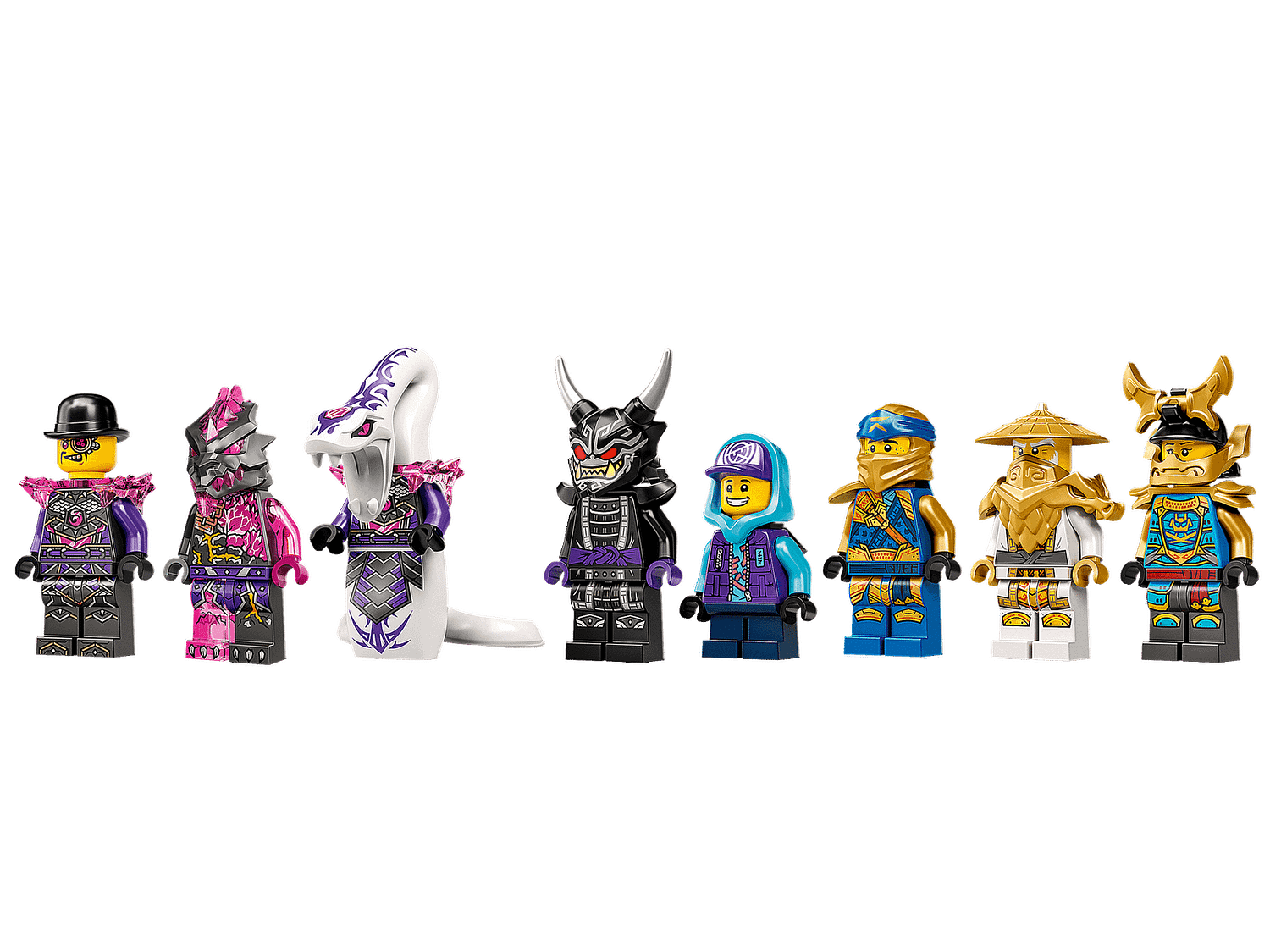 This impressive set is crammed with 8 minifigures: Samurai X Nya, Golden Jay, Master Wu, Oni Garmadon, Lil’ Nelson, General Pythor, The Mechanic and Vengestone Warrior. Many of these are exclusive, never-seen-before models, all primed to play out exciting battles!