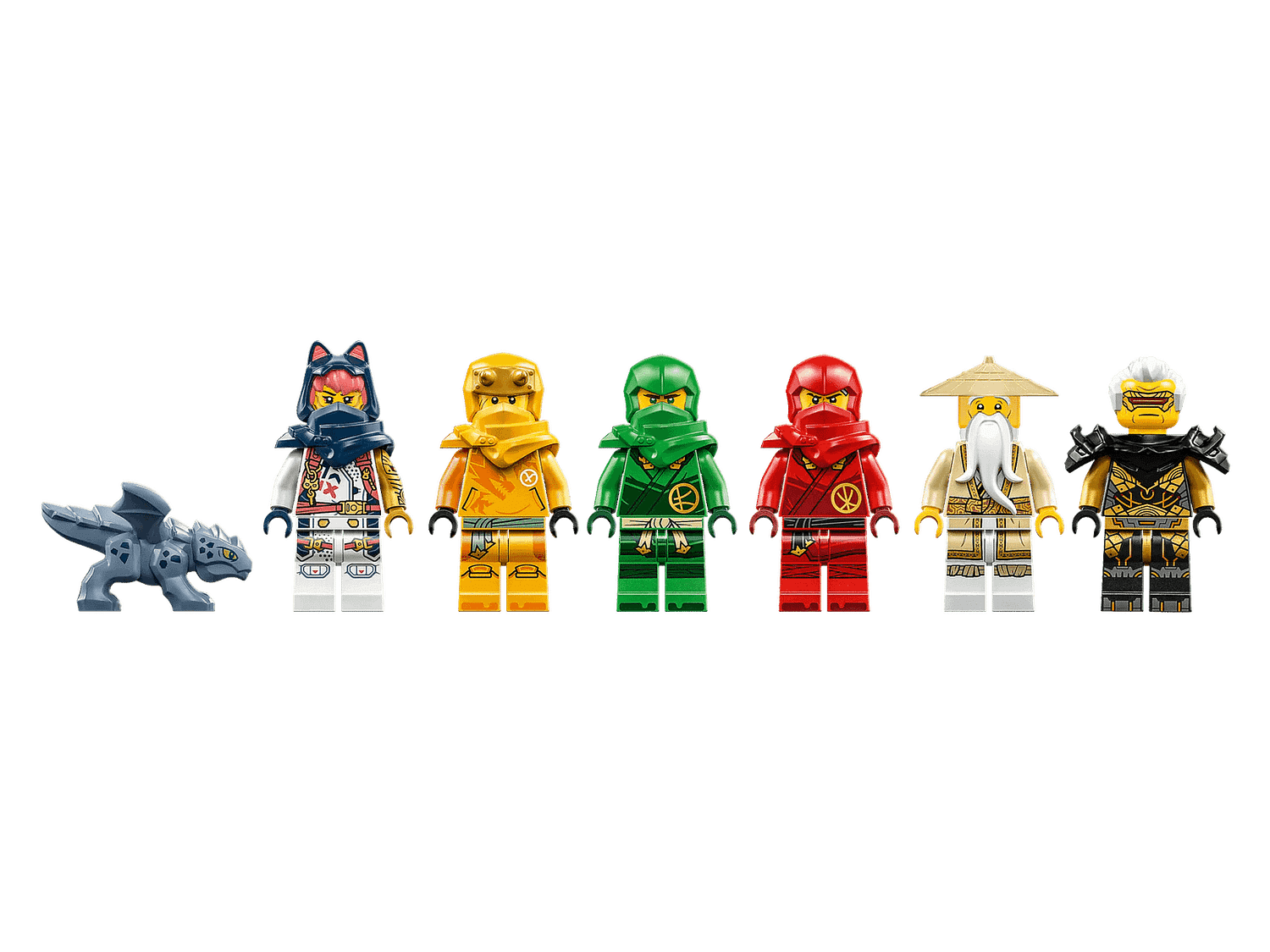 The premium playset comes with aBaby Riyu model and 6 minifigures: Master Wu with his staff, Arin with a grappling hook, Sora, Lloyd and Kai, who each have a golden katana, and Rapton with an Imperium sword and his own grappling hook for imaginative kids to play out gripping scenes from the NINJAGO® Dragons Rising TV series.