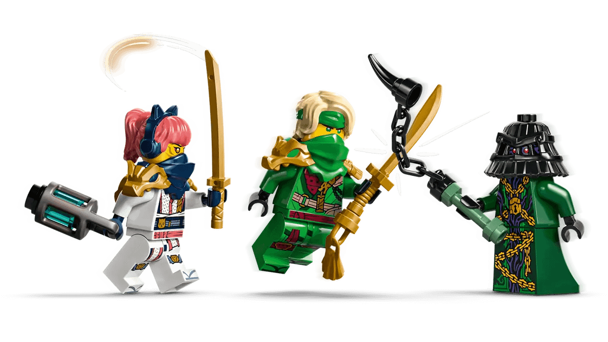 4 NINJAGO minifigures are included in the LEGO playset: ninja warriors Lloyd, Sora and Wyldfyre, each with a ninja weapon accessory, plus Master of Misfortune, Zarkt, for kids to play out epic good vs. evil battles. There is also a brick-built mini shrine with a secret message that Lloyd reveals with his translucent reveal blade accessory.