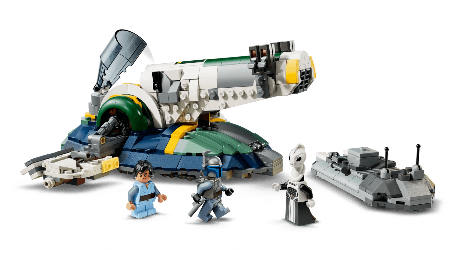 - 3 LEGO® Star Wars™ minifigures – Jango Fett with 2 blaster pistols and a jetpack, Young Boba Fett and Lama Su