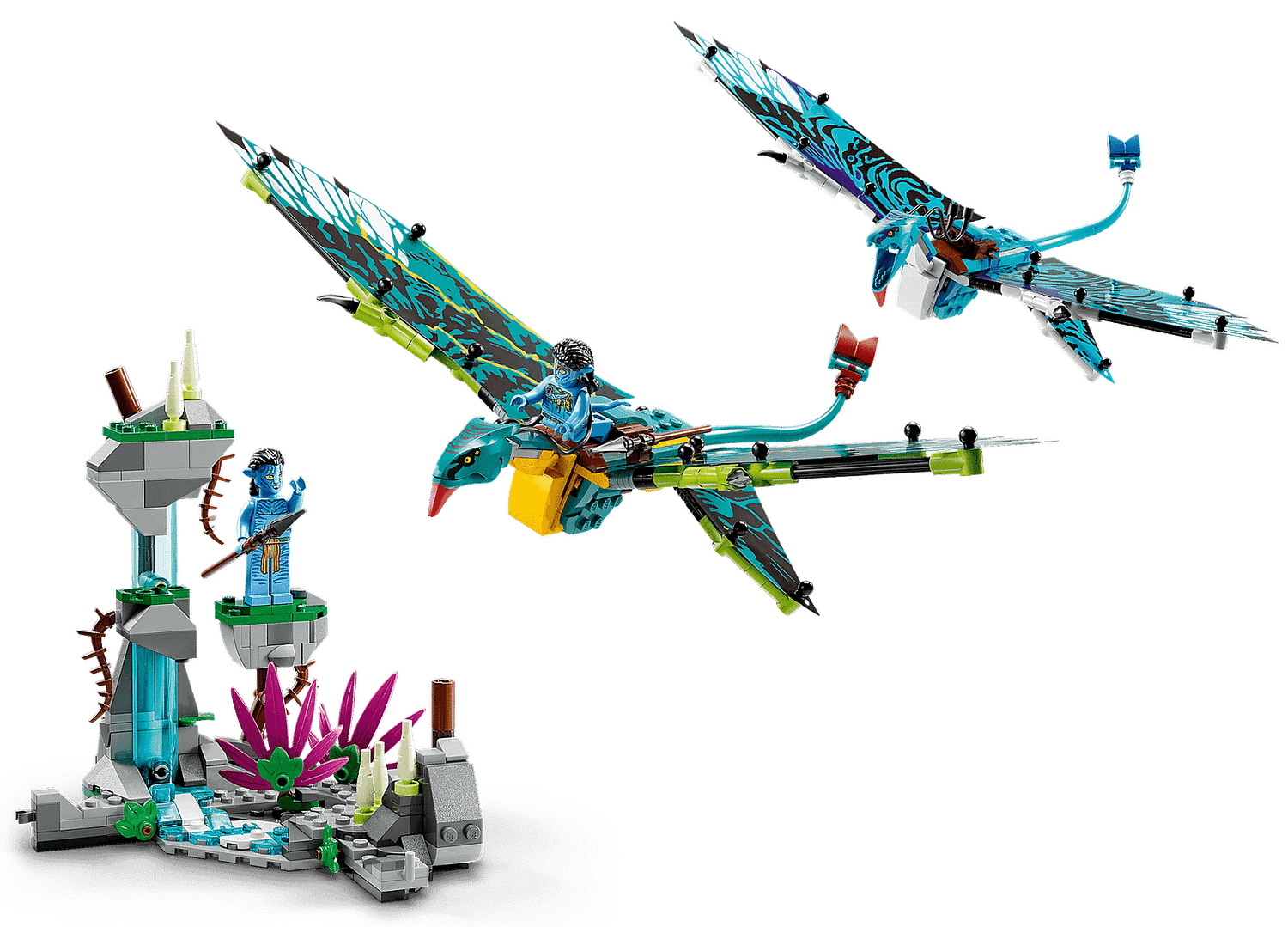- What’s inside – This immersive LEGO® set includes Jake Sully and Neytiri minifigures, 2 buildable Banshee figures with posable foil wings, plus a buildable mountain scene with glow-in-the-dark pieces