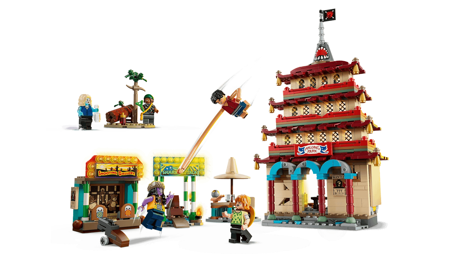 The building set comes with minifigures of Luffy – who comes with arm-lengthening pieces – Nami, Usopp, Arlong and Chu. Kids can collapse the pagoda model during battle by tapping it firmly on top, and the shooting gallery has fun targets for kids to aim at with stud-shooters. Villainous Arlong can be placed on a throne inside the shark attack building. Chu can get a drink at the shack, and the forest contains an iconic ketchup bottle. This playset also contains stud-shooters and accessories, including 3 ‘Wanted’ posters. For added digital fun, builders can zoom in, rotate models in 3D and track their progress using the intuitive LEGO Builder app. Set contains 926 pieces.