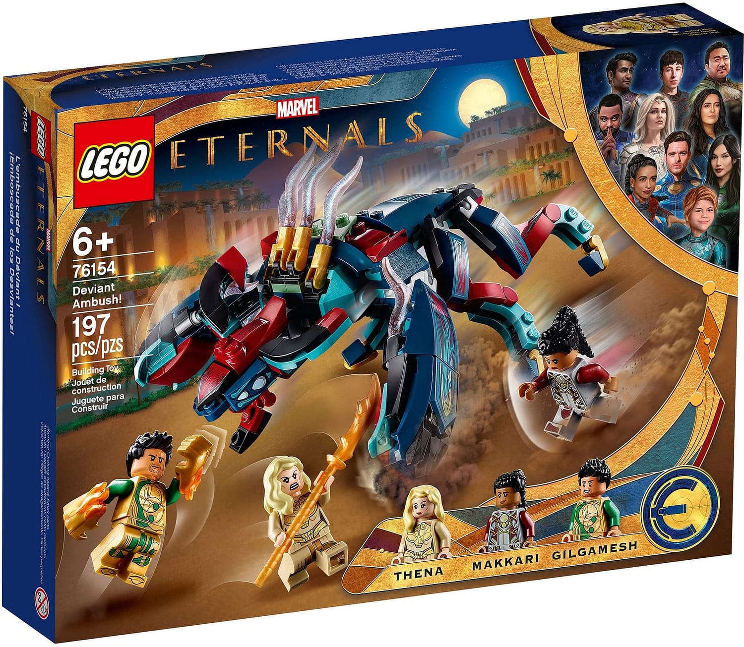 • Includes 3 LEGO® Marvel Eternals superhero minifigures – Thena, Makkari and the exclusive Gilgamesh – a posable, 6-legged Deviant with an open-and-close mouth, a dagger, fist weapon and a shooter.
