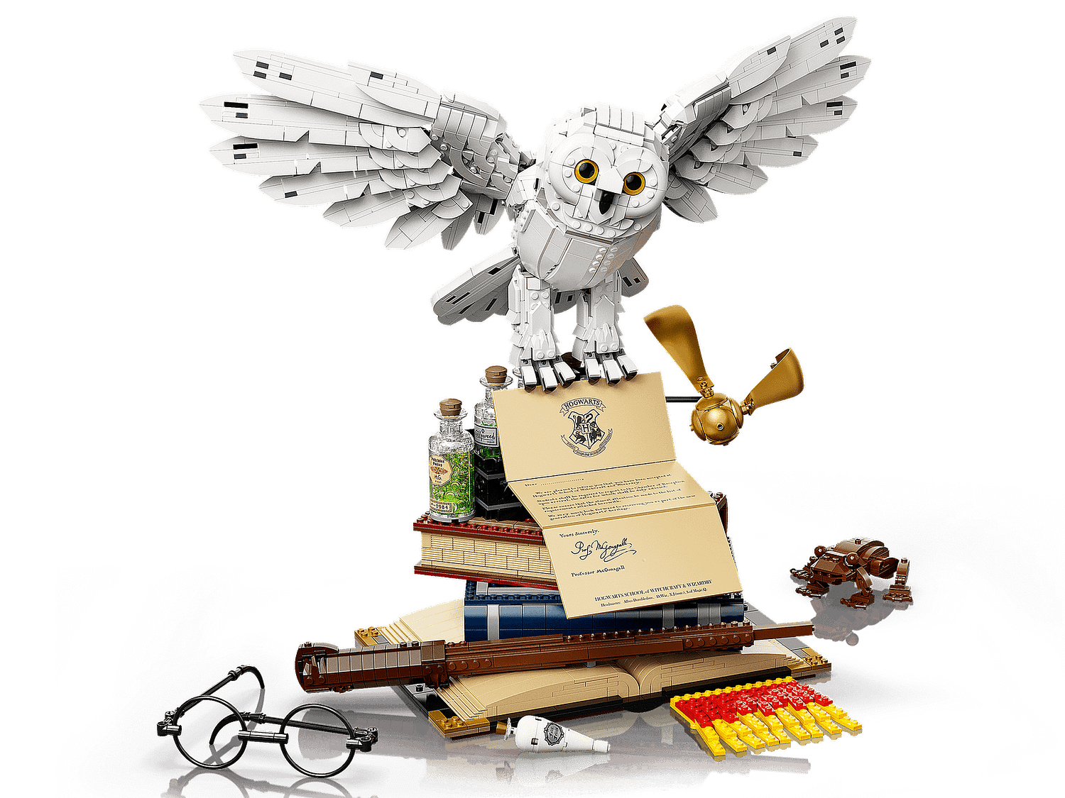 This homage to the Wizarding World of Harry Potter features many iconic artefacts in a single, stunning model. There’s Harry’s wand and glasses; Ron’s chocolate frog; Hermione’s potion tray containing 5 bottles of potions and magical ingredients (including Gillyweed, Felix Felicis ‘liquid luck’ and Polyjuice); Tom Riddle’s diary; the Golden Snitch; and a school scarf (customizable to suit any Hogwarts™ House). On top of this enchanting ensemble sits Hedwig™ the owl, holding a much-coveted invitation to Hogwarts. This fascinating model is accompanied by 3 exclusive golden minifigures – Albus Dumbledore™, Minerva McGonagall™ and Rubeus Hagrid™ – and a display stand with a decorated tile celebrating 20 years of LEGO Harry Potter.