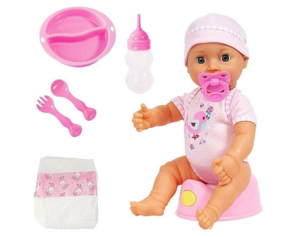 Doll has sleepy eyes and once fed with the bottle, needs to wee.