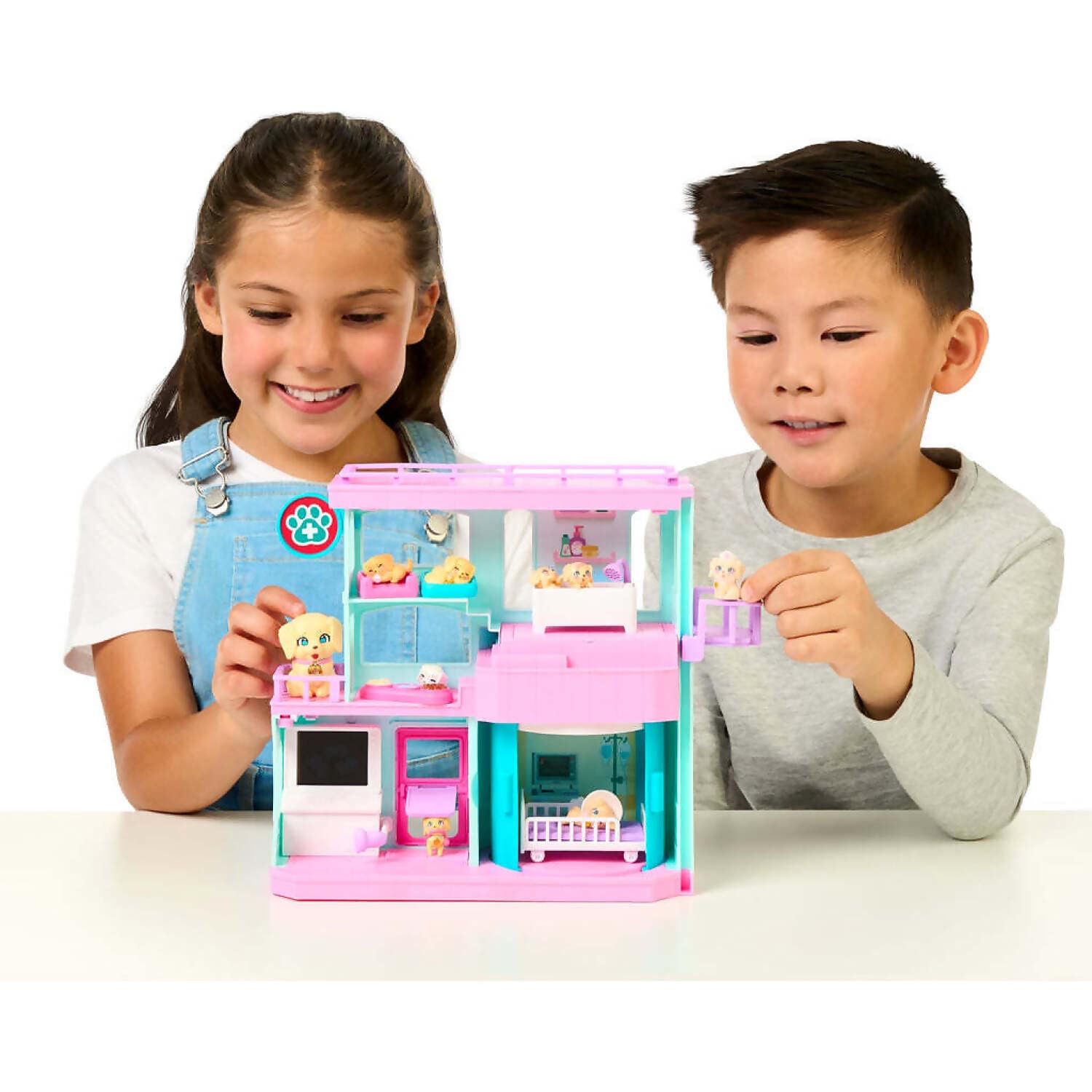 With multiple levels and play areas for Mama and her Retriever puppies, this double sided playset offers so many opportunities to play and display your pups! Scan Mama on the X-ray to see how many puppies she’s expecting. Wipe her cheeks with water and see them turn rosy! She’s ready to reveal her babies!