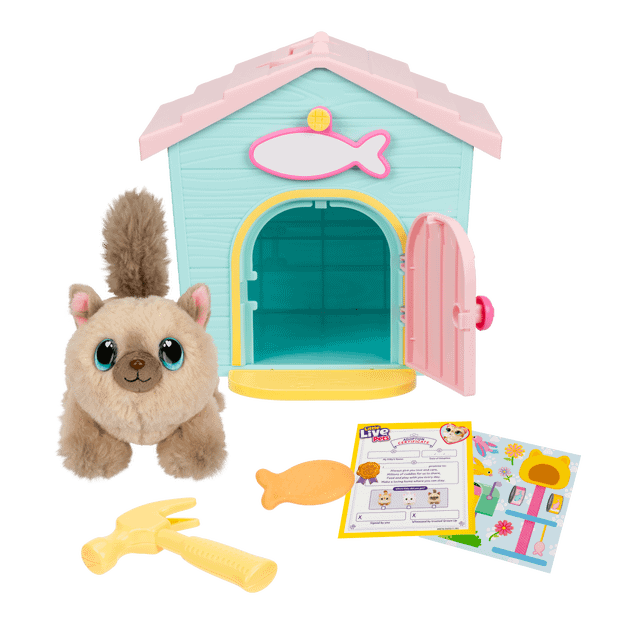 - Includes: 1 x Adoption Certificate, 1 x Fish Accessory, 1 x Name Plate, 1 x Doormat, 1 x Door, 1 x Hammer Tool, 1 x Instruction Manual, 1 x Nail, 1 x House Playset, 1 x Plush Kitten, 1 x Sticker Sheet